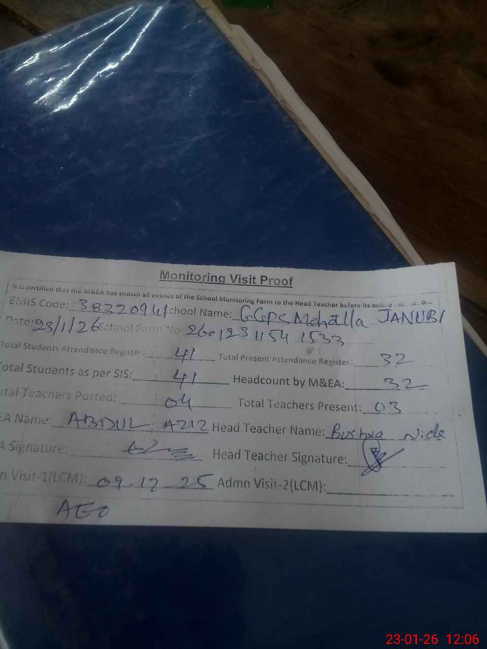 | Attendance Register | Head Teacher | MEA with School | Visit Proof |