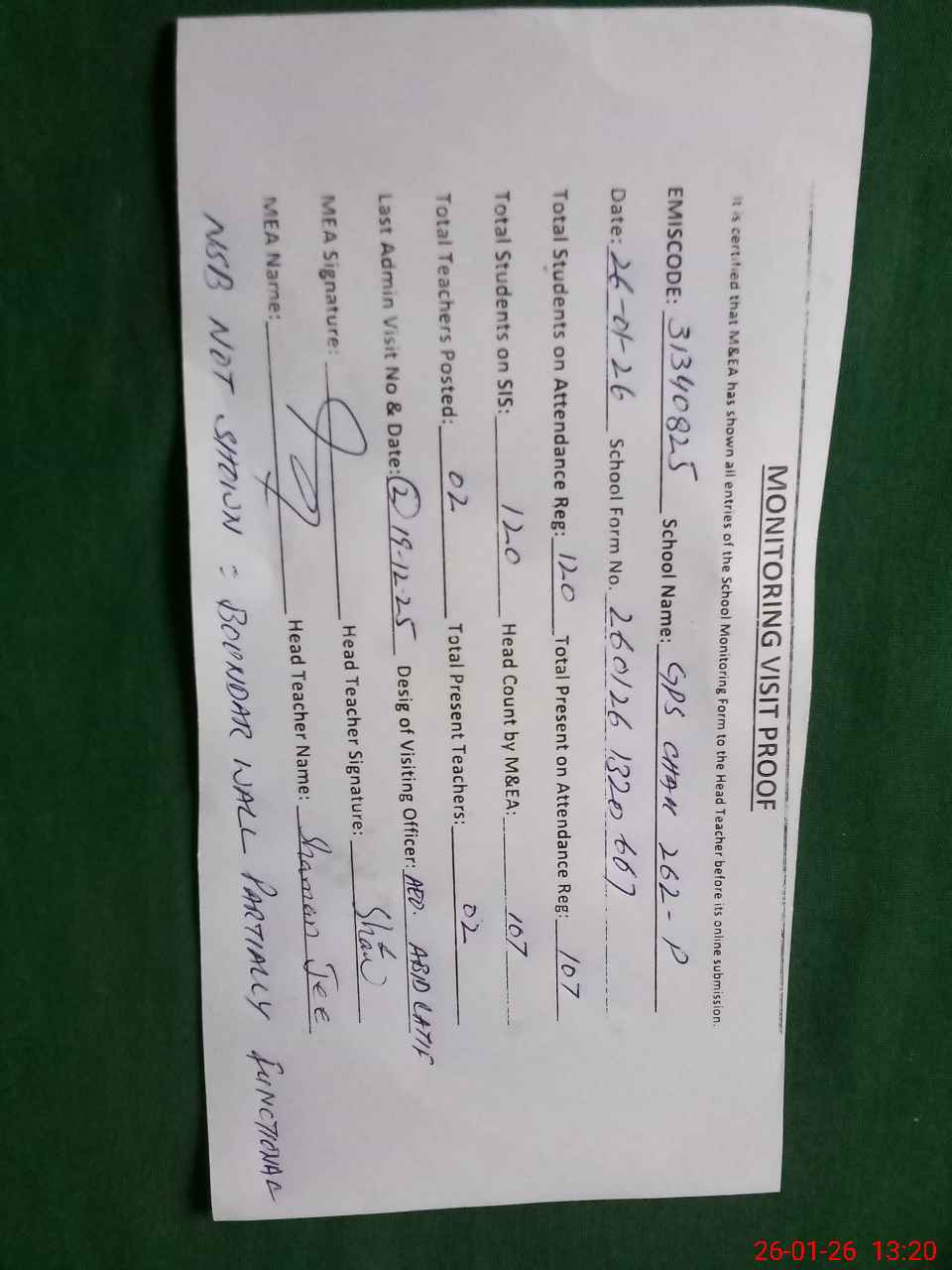 | Attendance Register | Head Teacher | MEA with School | Visit Proof |