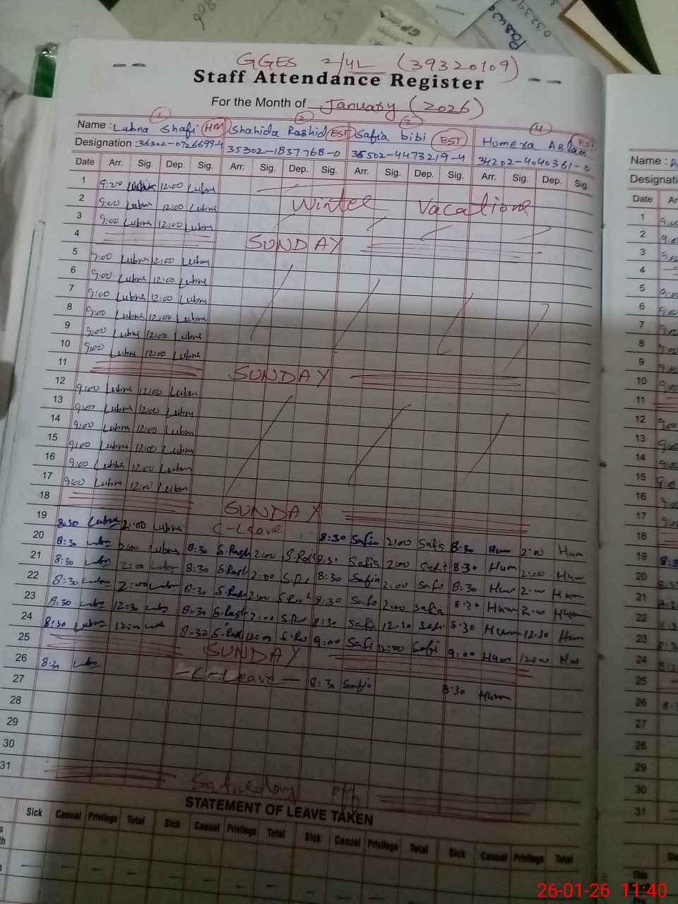 | Leave | Duty | Absent | Maternity | Medical | Ex- Pak |
