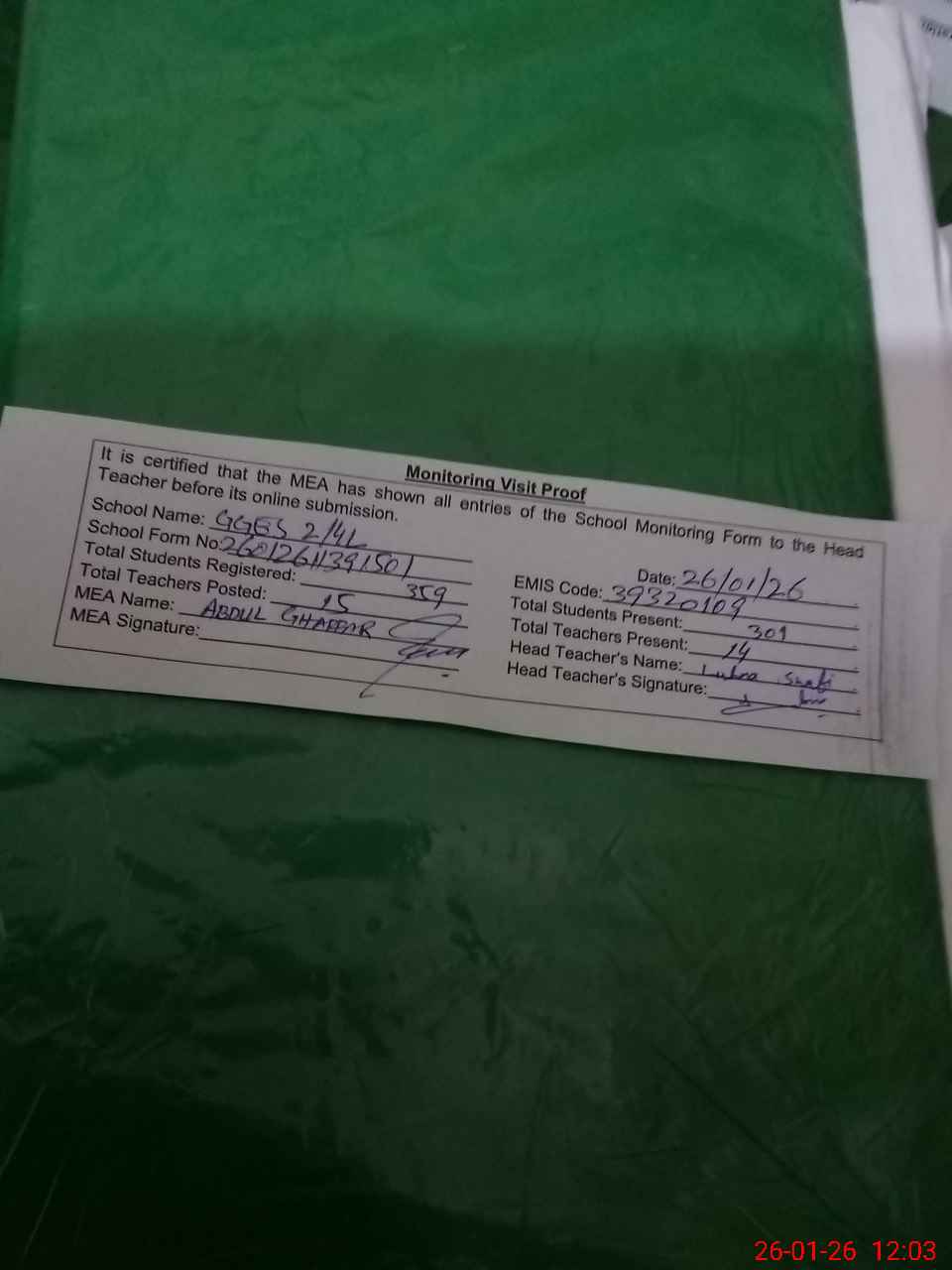 | Attendance Register | Head Teacher | MEA with School | Visit Proof |