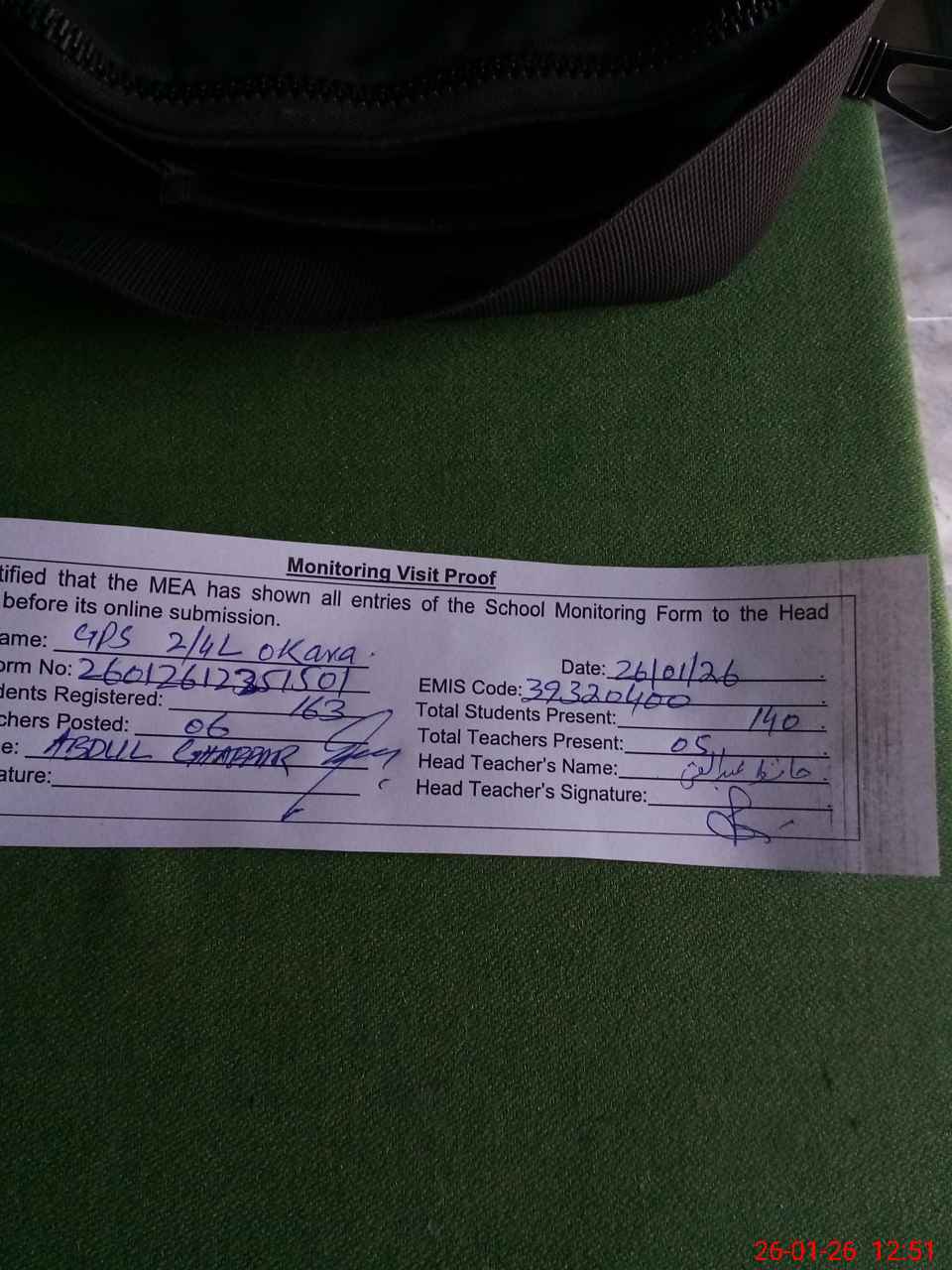 | Attendance Register | Head Teacher | MEA with School | Visit Proof |