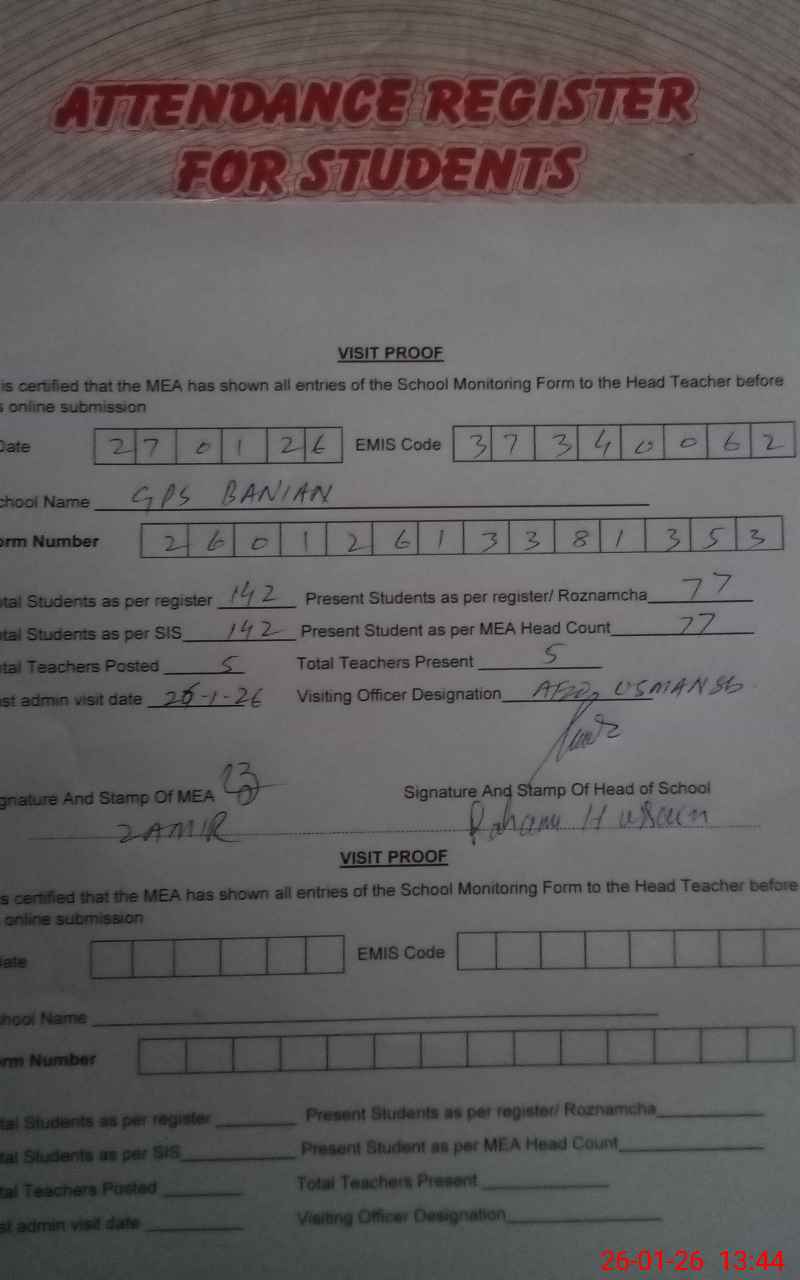 | Attendance Register | Head Teacher | MEA with School | Visit Proof |