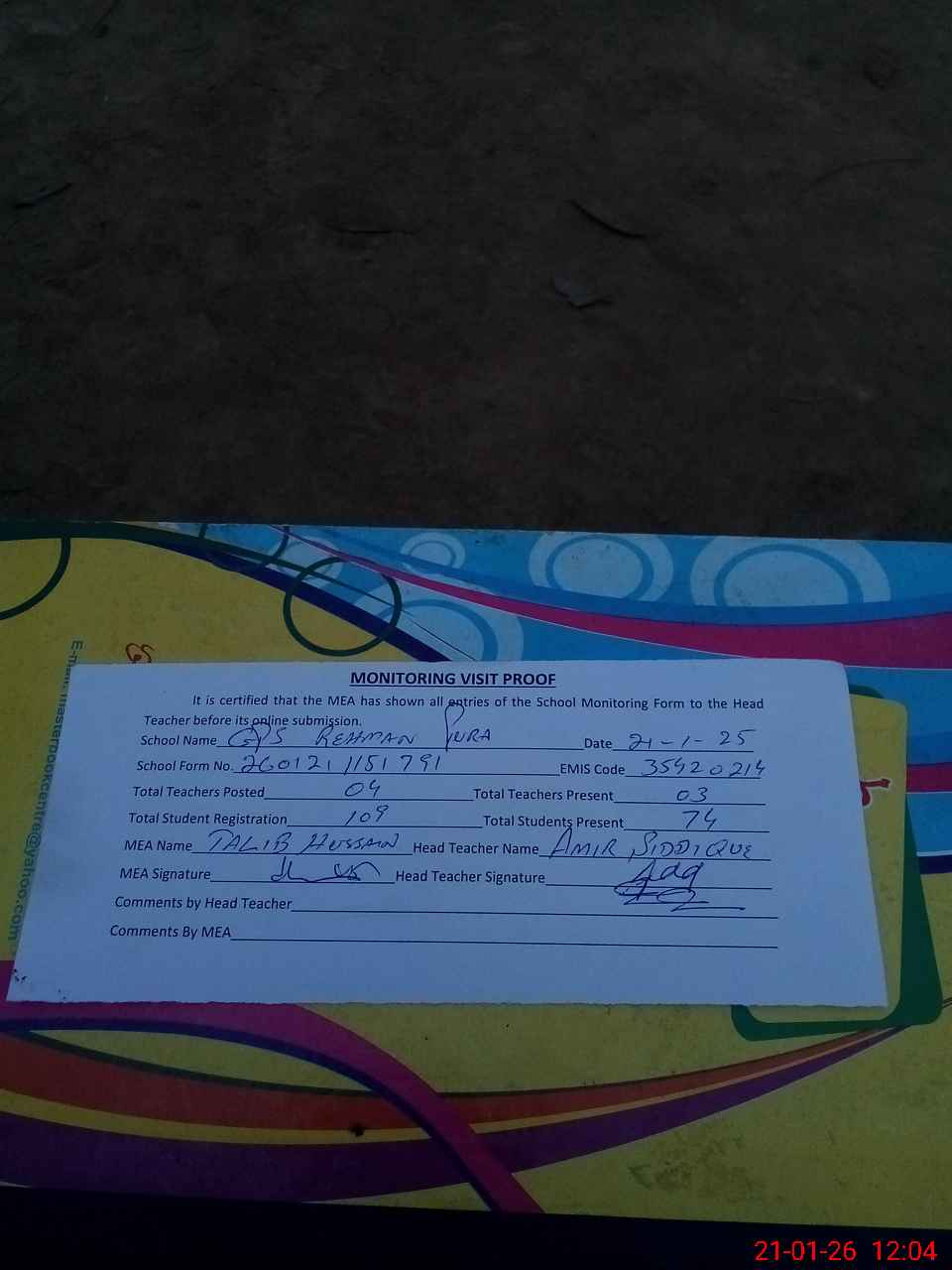 | Attendance Register | Head Teacher | MEA with School | Visit Proof |