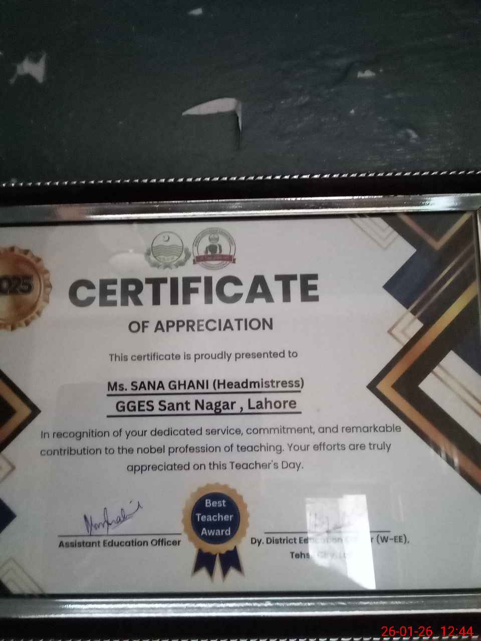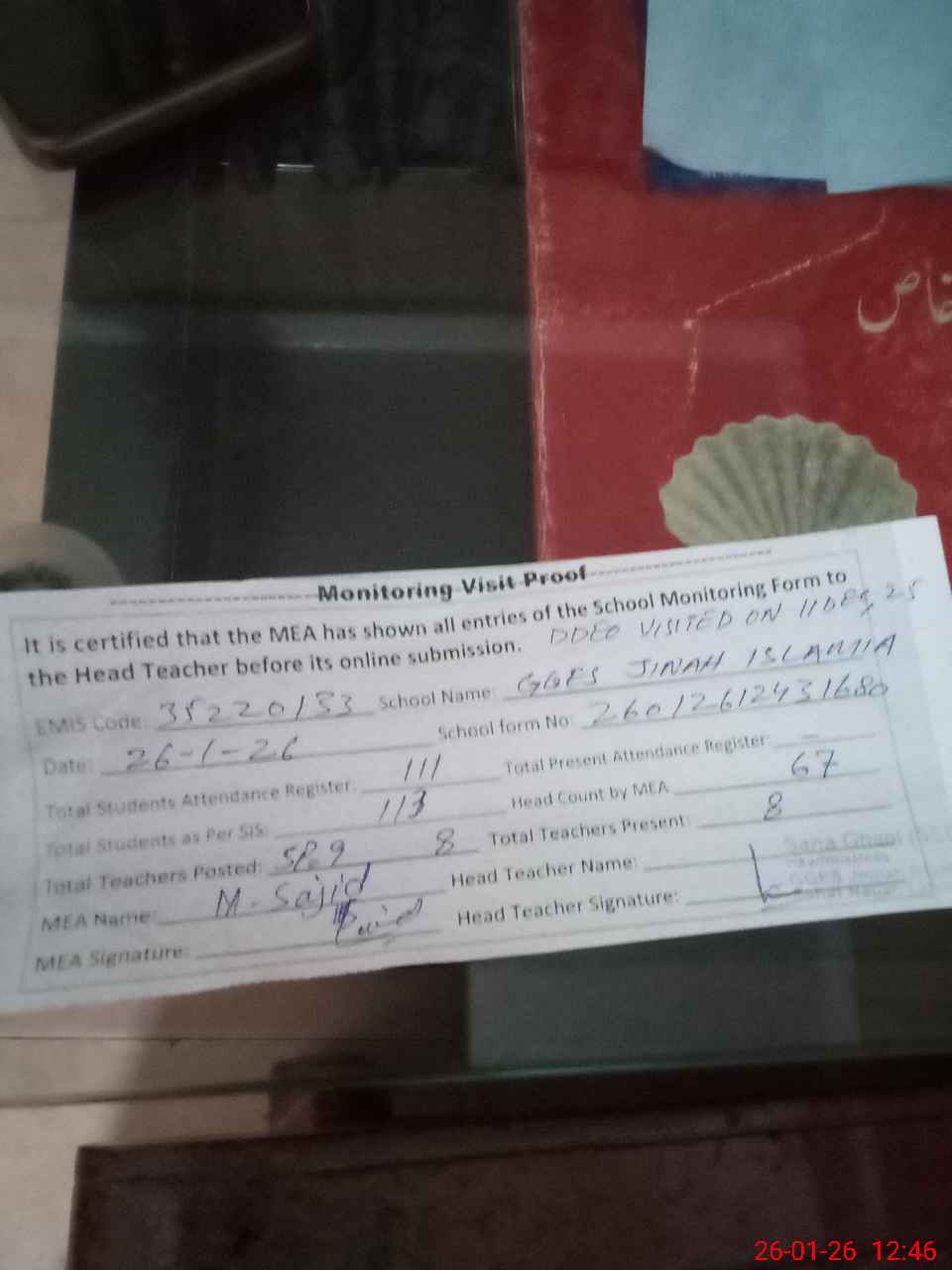 | Remarks (Use Separate Page if Required): Present students percentage is 59 percent Roznamcha is incomplete 35220133 | |||||