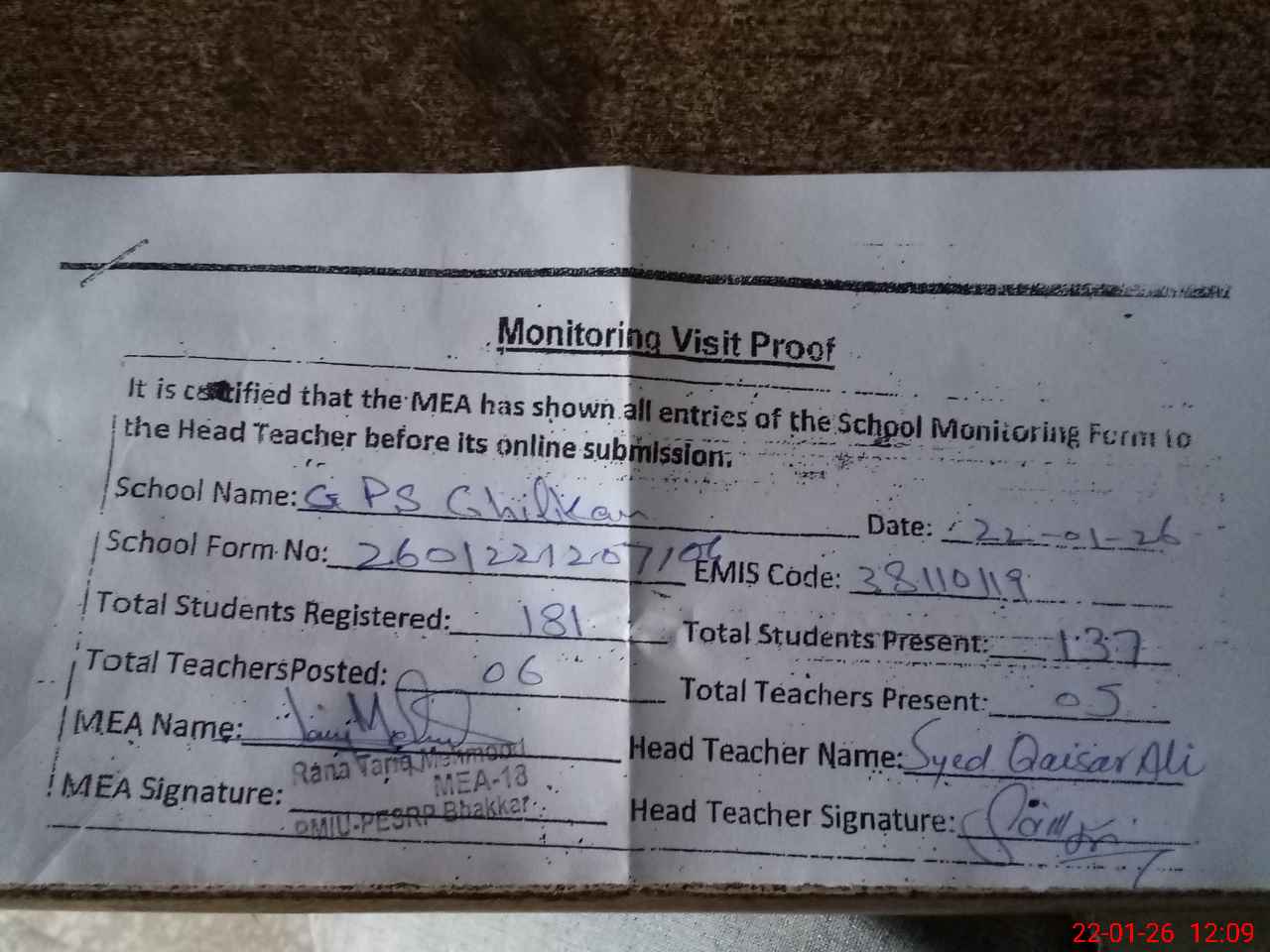 | Attendance Register | Head Teacher | MEA with School | Visit Proof |