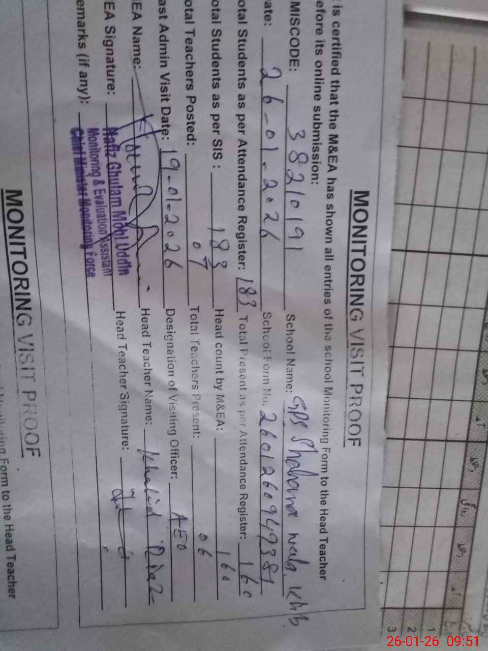| Attendance Register | Head Teacher | MEA with School | Visit Proof |