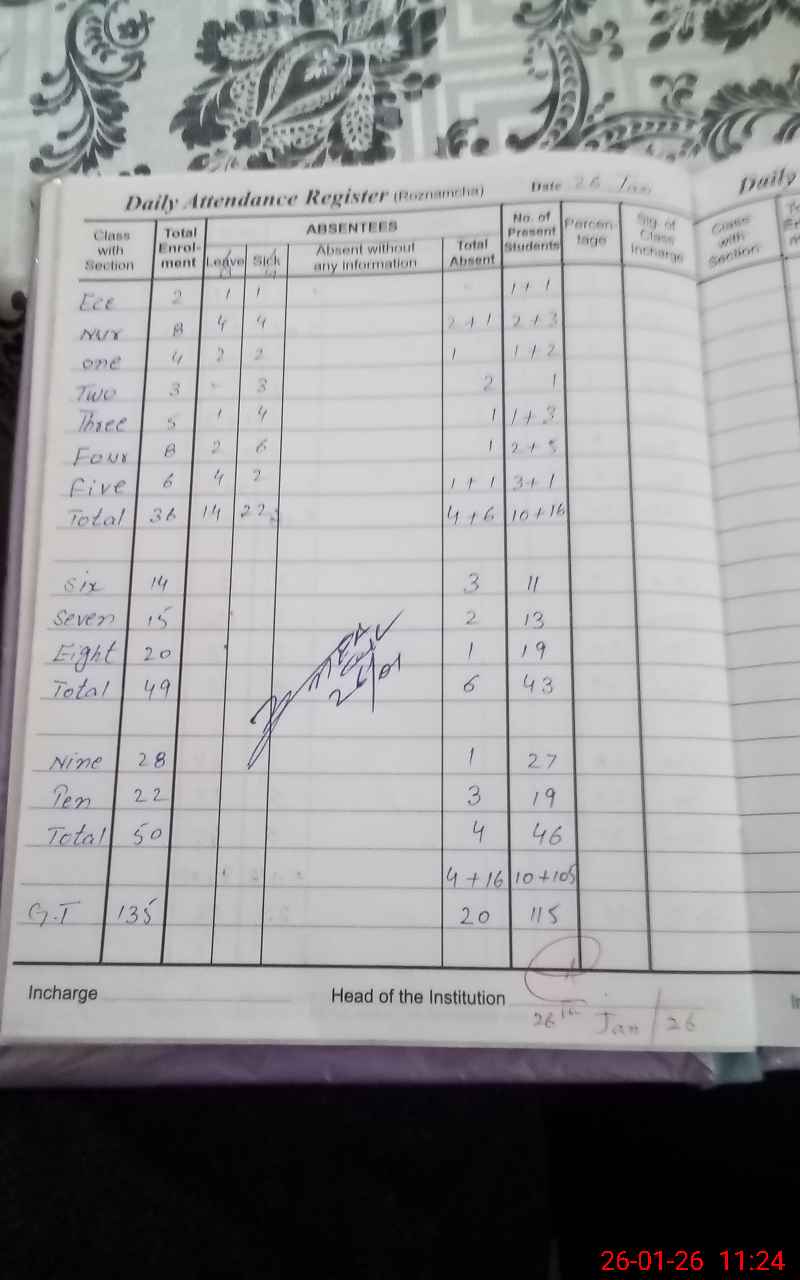 | Total Students Present | 0 | 2 | 3 | 1 | 4 | 7 | 4 | 11 | 13 | 19 | 27 | 19 | 115 | |||