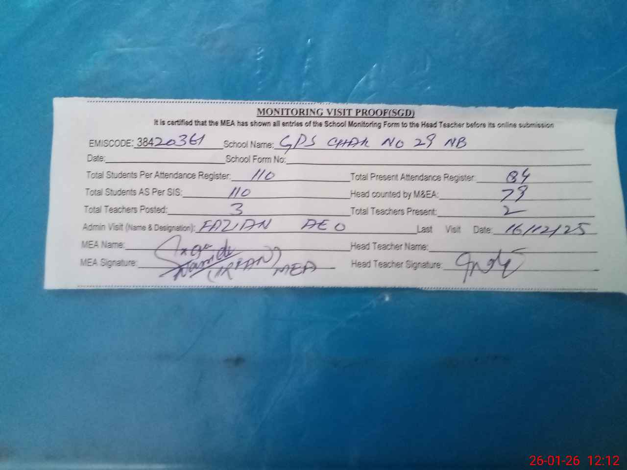 | Attendance Register | Head Teacher | MEA with School | Visit Proof |