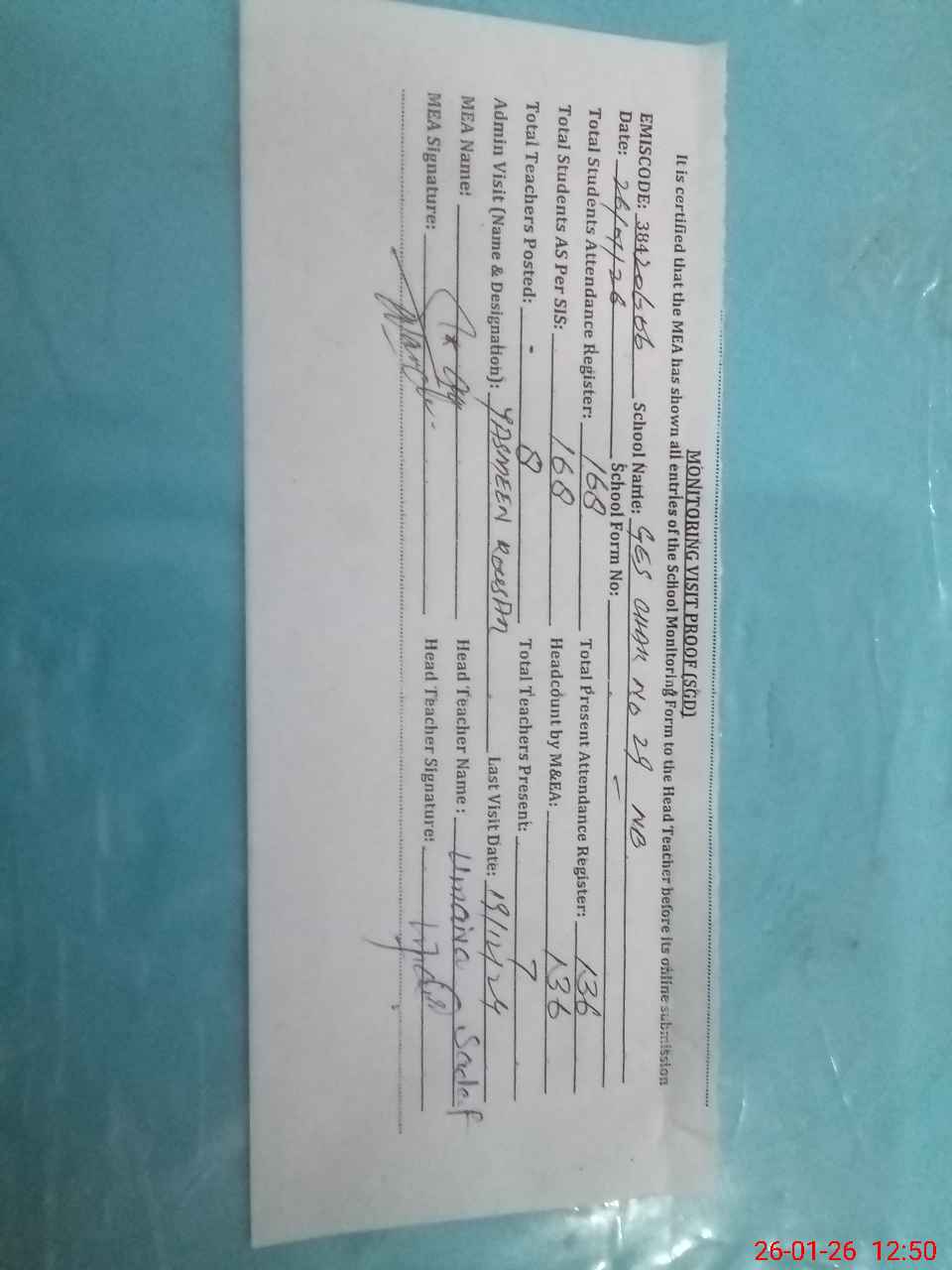 | Attendance Register | Head Teacher | MEA with School | Visit Proof |