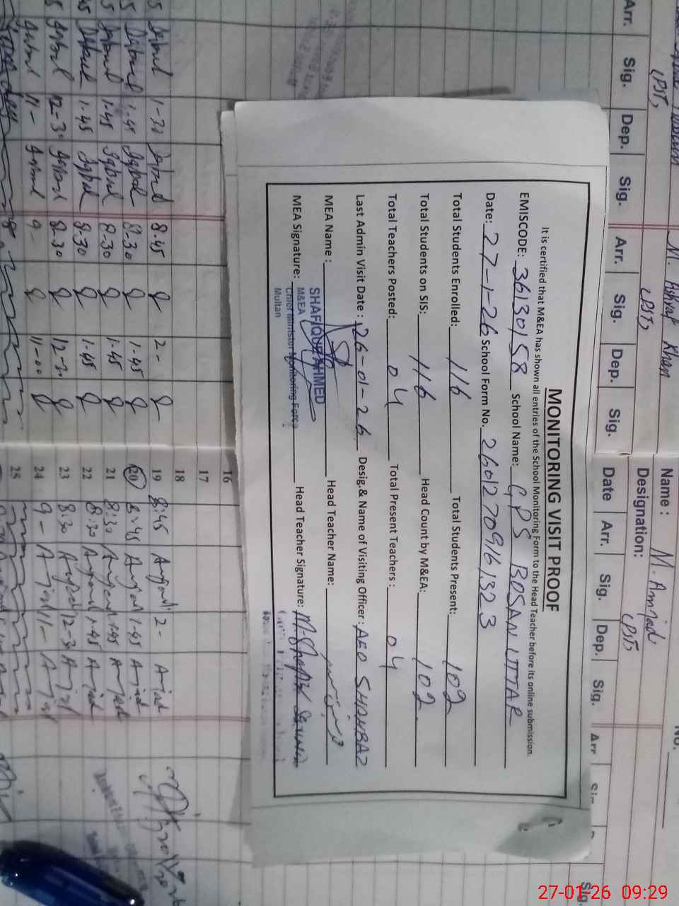 | EMIS Code: 36130158 | Name of School: GPS BOSAN UTTAR MULTAN | |||
