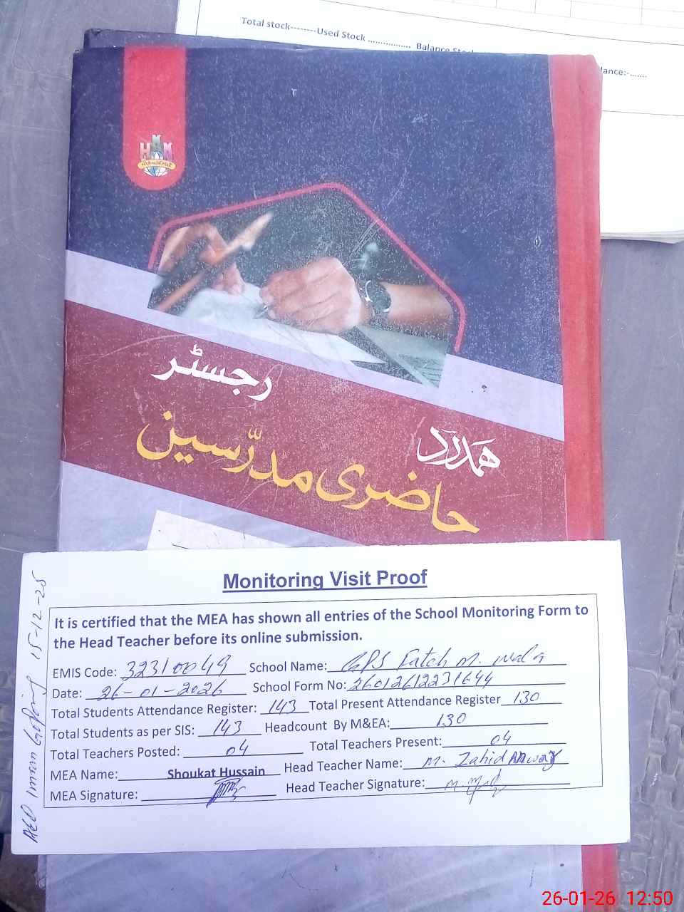 | Attendance Register | Head Teacher | MEA with School | Visit Proof |