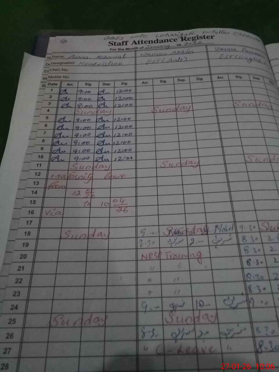 | CNIC | Full Name | Designation | R/C | Absence During Last Calender Month |