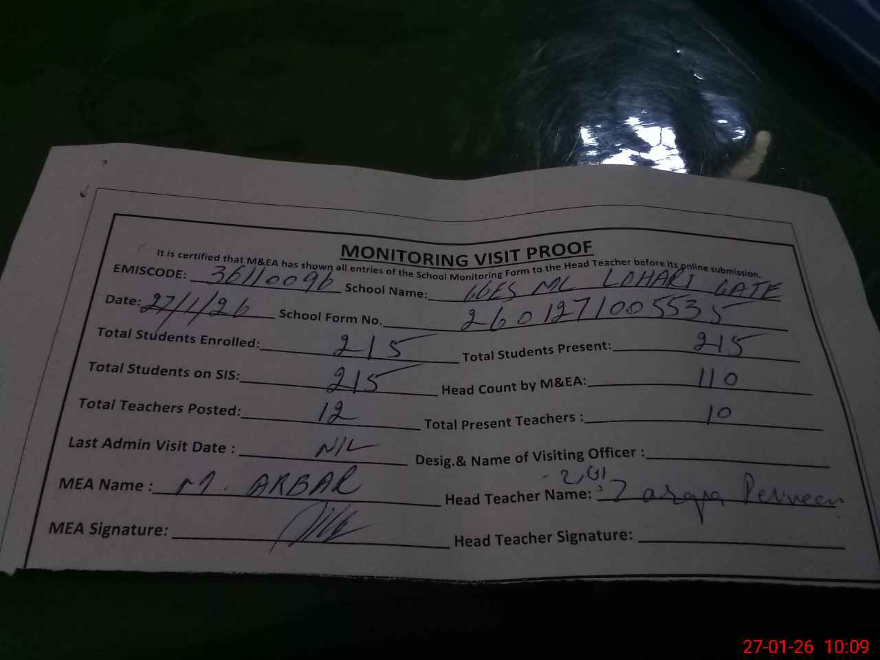 | Attendance Register | Head Teacher | MEA with School | Visit Proof |