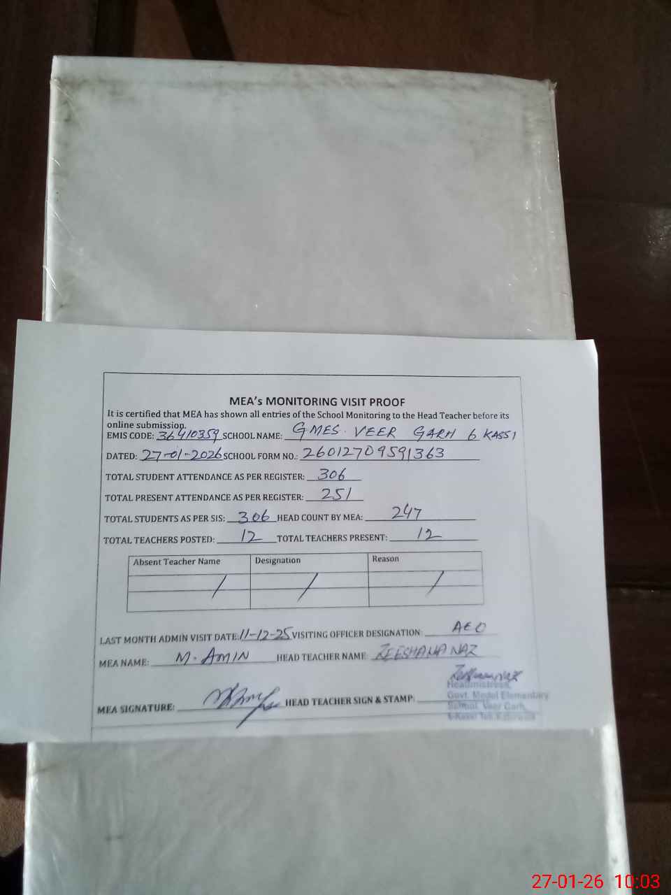 | Attendance Register | Head Teacher | MEA with School | Visit Proof |