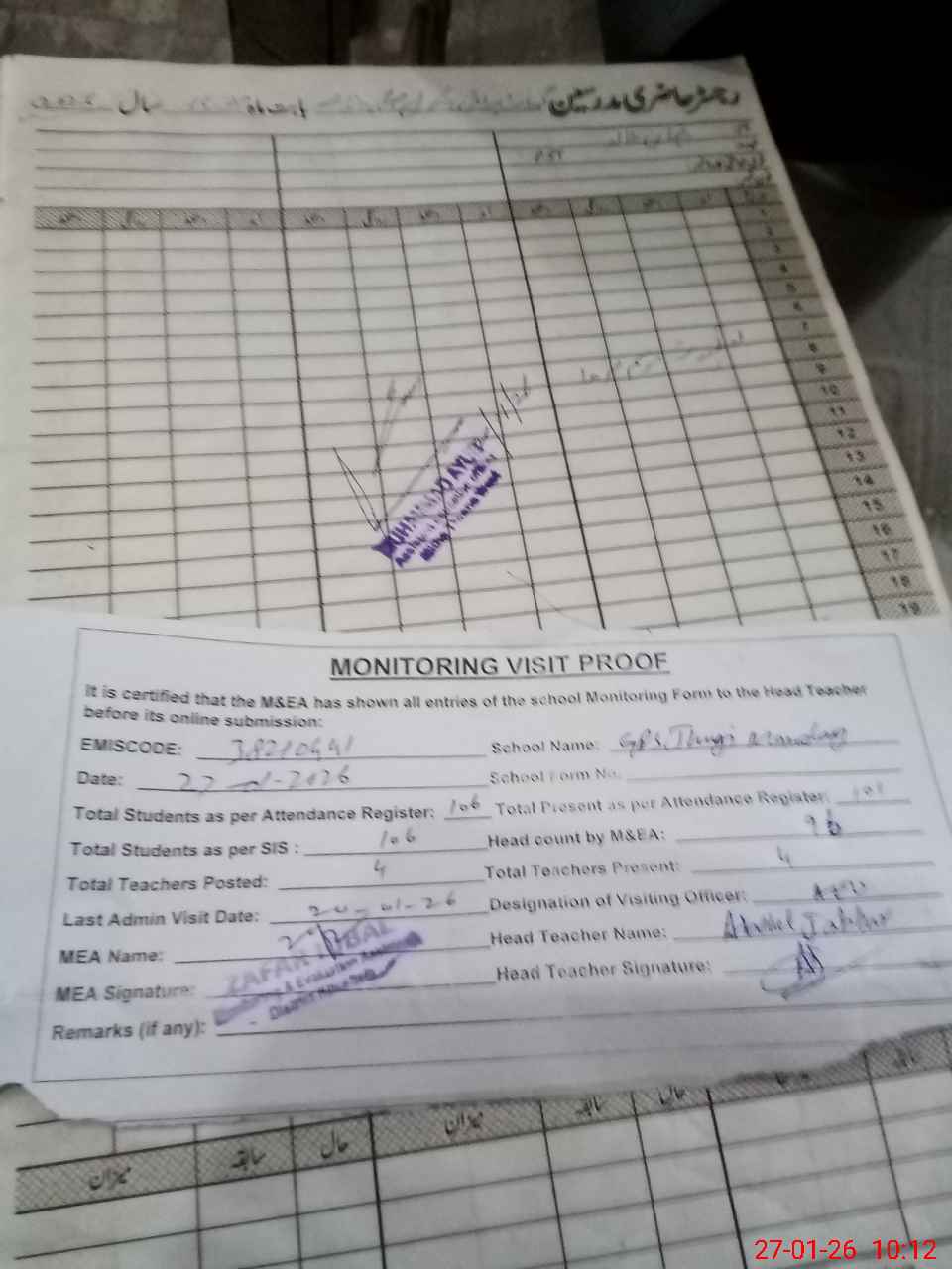 | Attendance Register | Head Teacher | MEA with School | Visit Proof |
