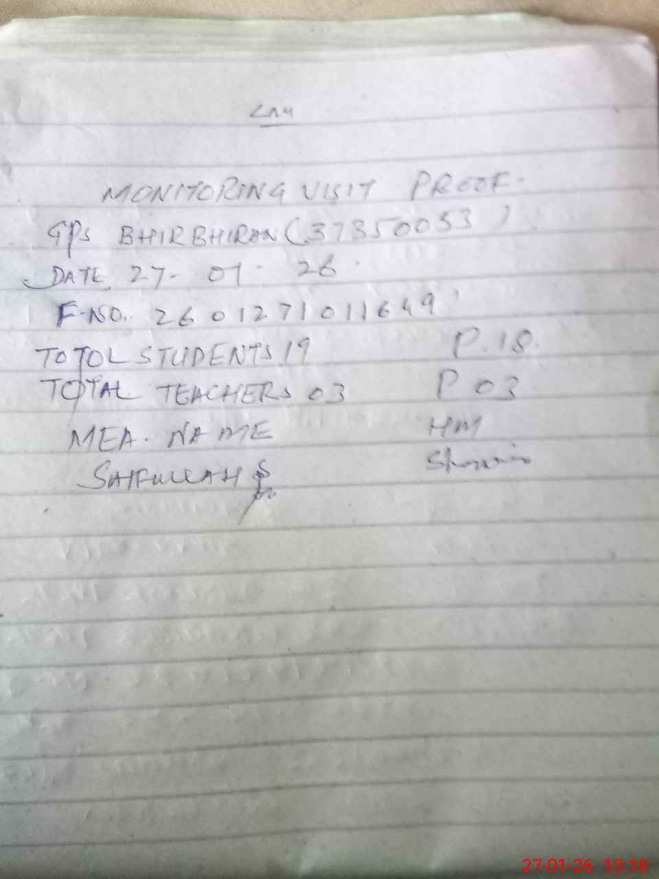 | Attendance Register | Head Teacher | MEA with School | Visit Proof |