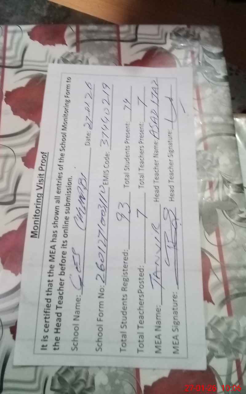 | Attendance Register | Head Teacher | MEA with School | Visit Proof |