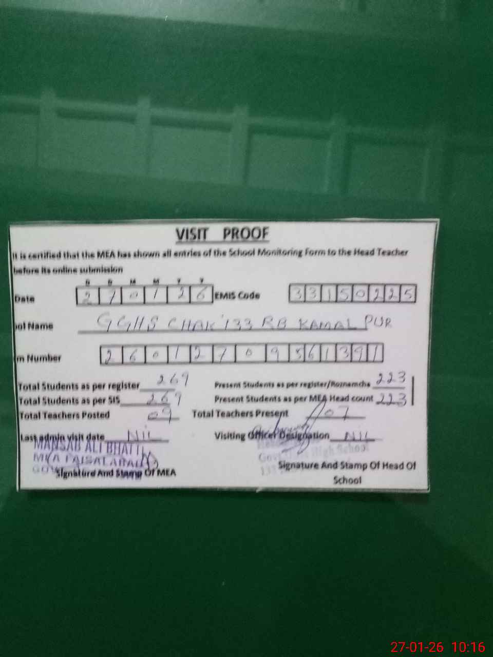 | Attendance Register | Head Teacher | MEA with School | Visit Proof |