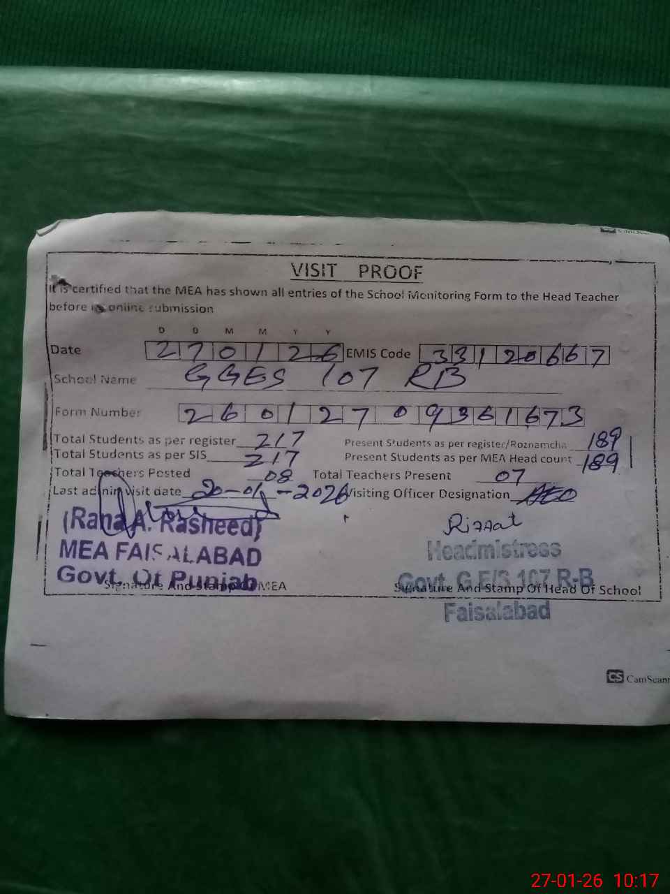 | Attendance Register | Head Teacher | MEA with School | Visit Proof |