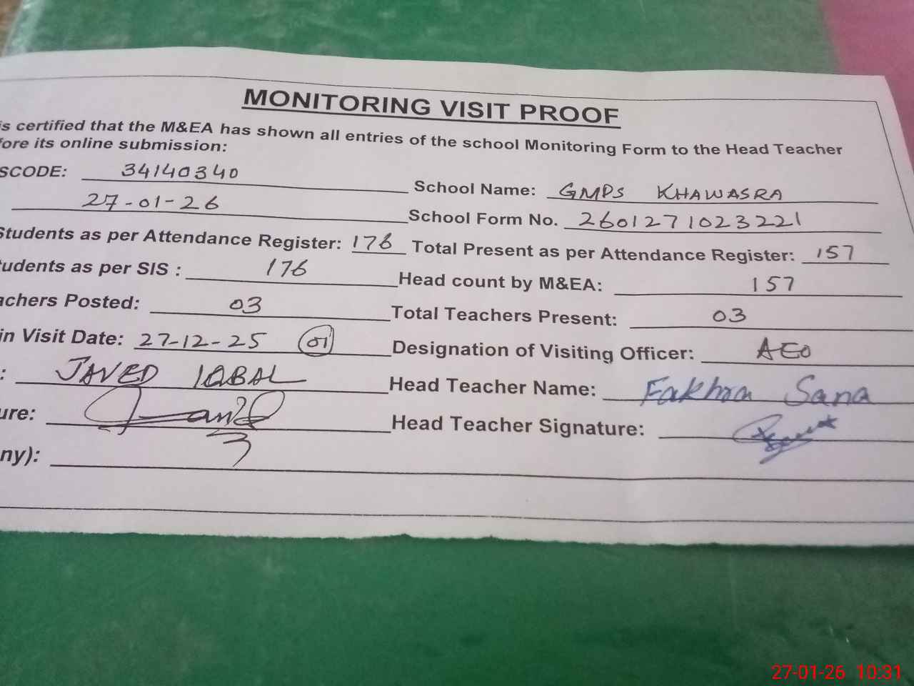 | Attendance Register | Head Teacher | MEA with School | Visit Proof |