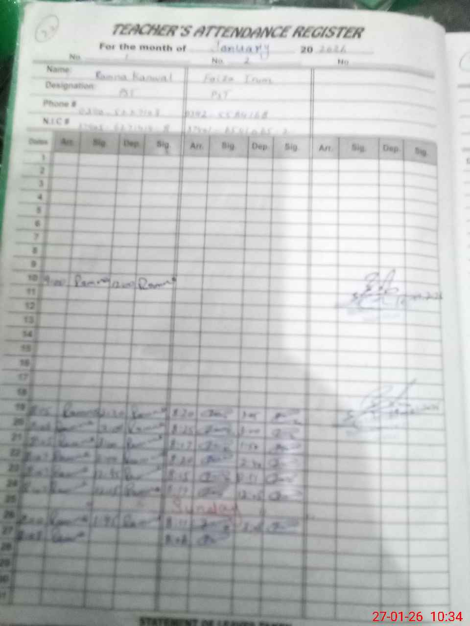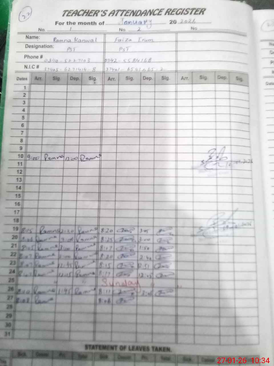 | CNIC | Full Name | Designation | R/C | Absence During Last Calender Month |