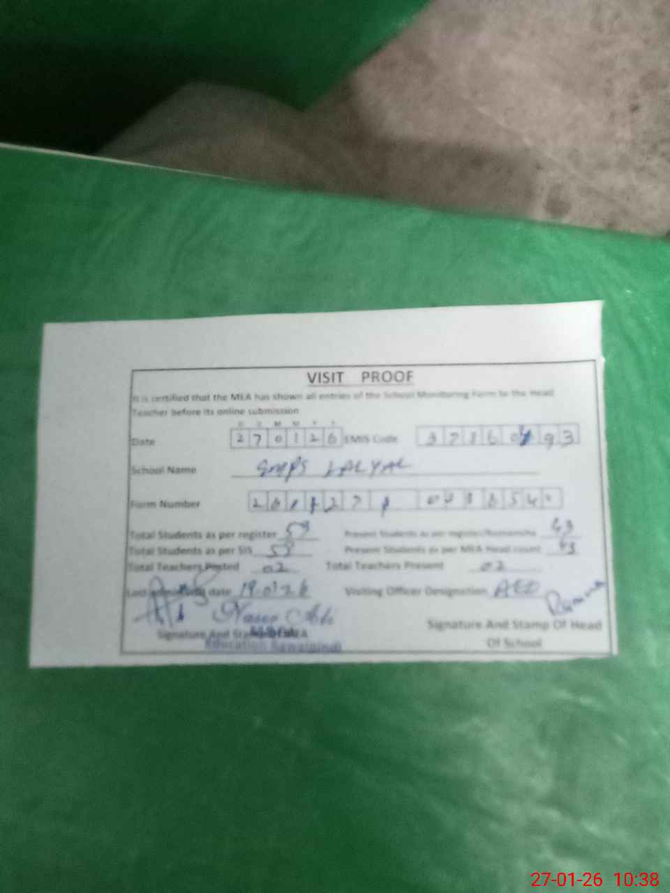 | Attendance Register | Head Teacher | MEA with School | Visit Proof |