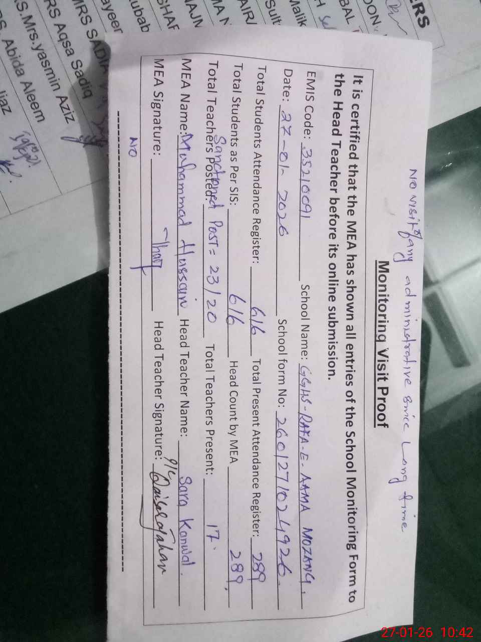 | Attendance Register | Head Teacher | MEA with School | Visit Proof |