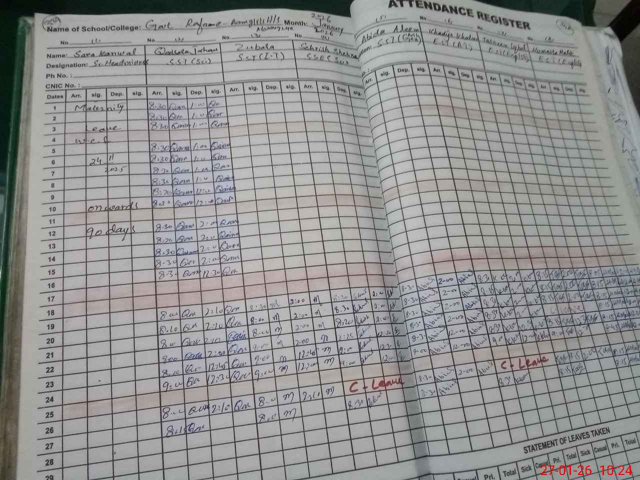 | 35**** | Sa**** Ka**** | Sr. Headmaster | Regular | 31 | 0 | 0 | 31 | 0 | 0 | 0 | 0 | 0 | Maternity |