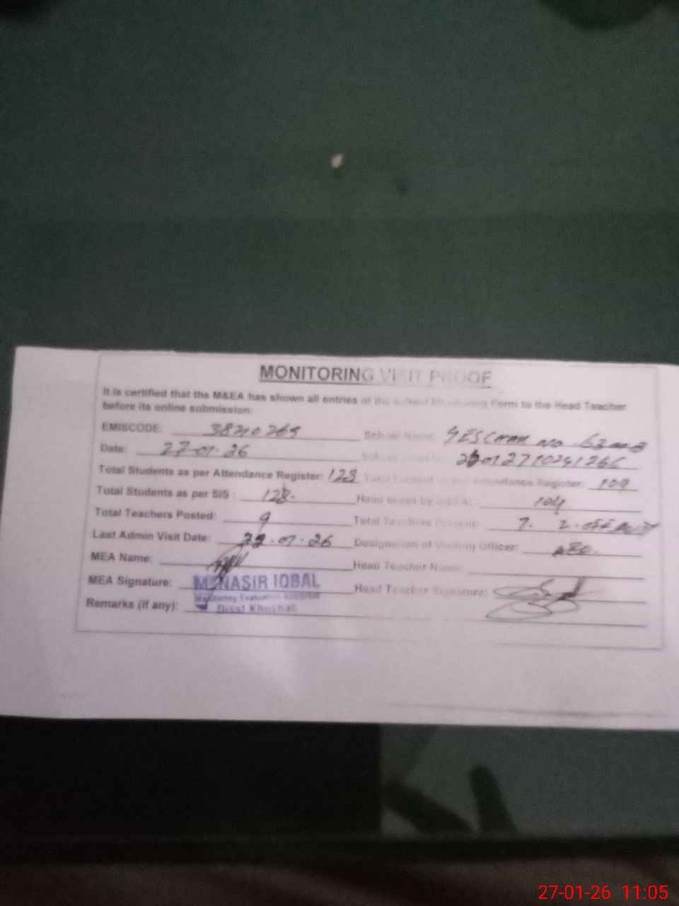 | Attendance Register | Head Teacher | MEA with School | Visit Proof |