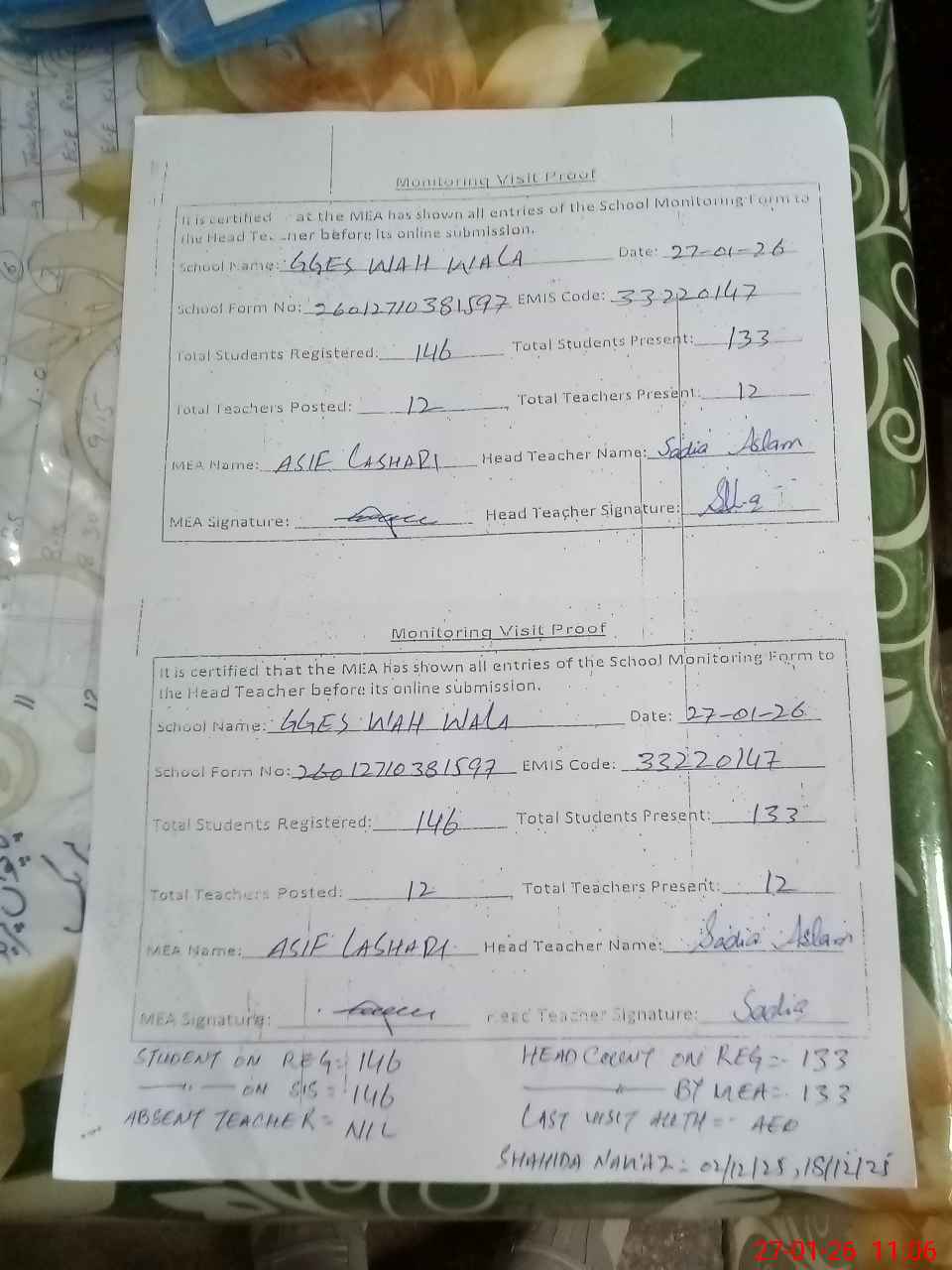 | Attendance Register | Head Teacher | MEA with School | Visit Proof |