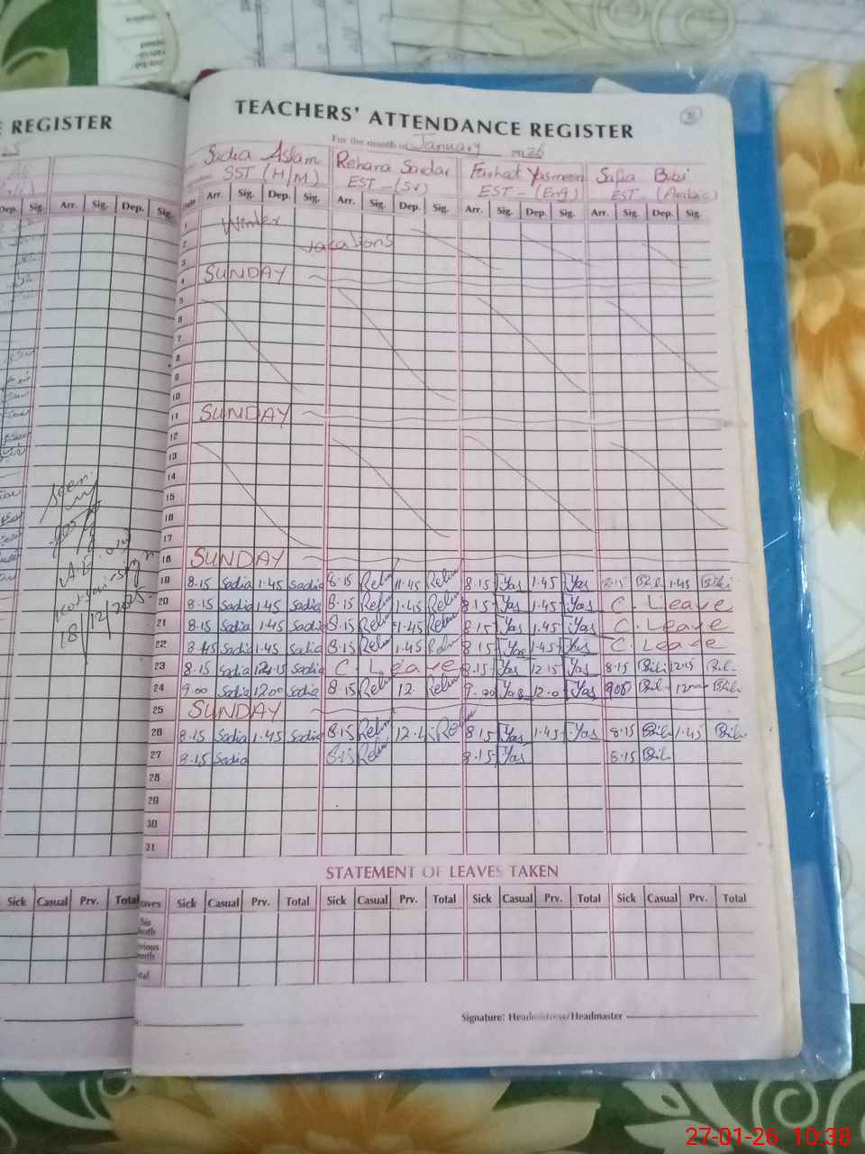 | Leave | Duty | Absent | Maternity | Medical | Ex- Pak |