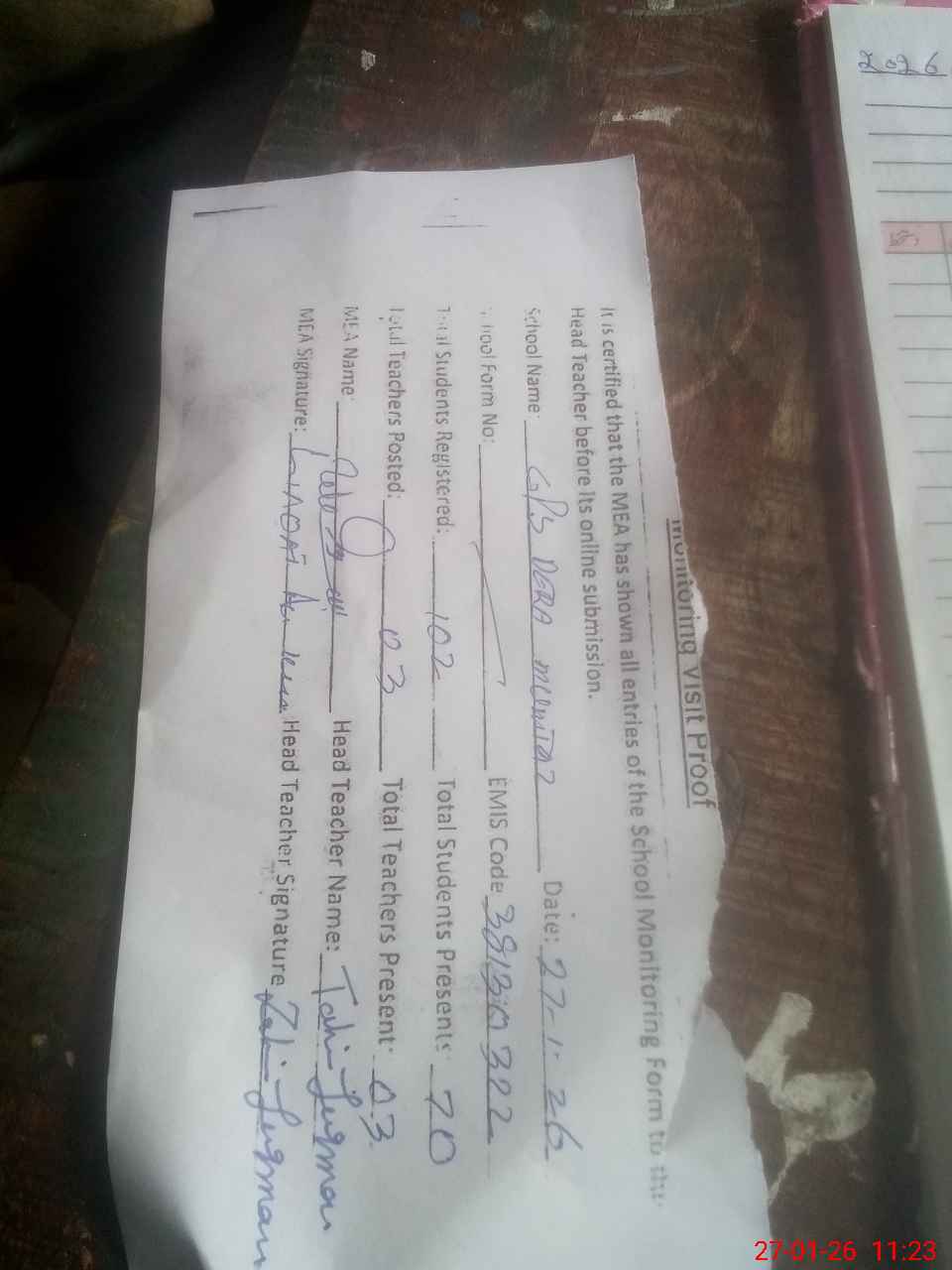 | Attendance Register | Head Teacher | MEA with School | Visit Proof |