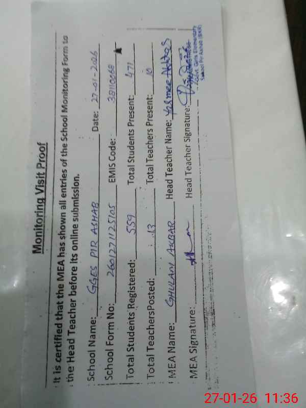 | Attendance Register | Head Teacher | MEA with School | Visit Proof |