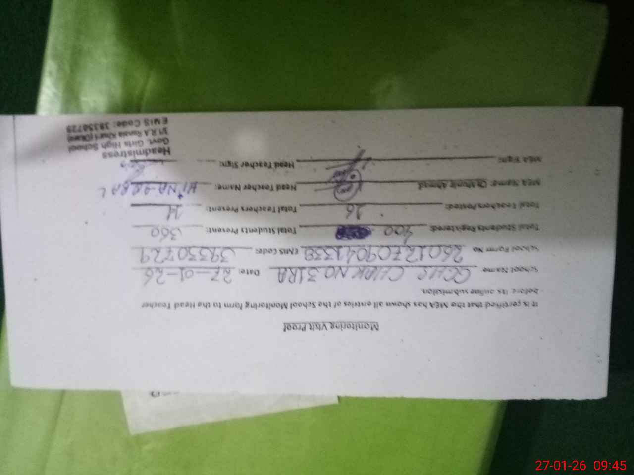 | Attendance Register | Head Teacher | MEA with School | Visit Proof |
