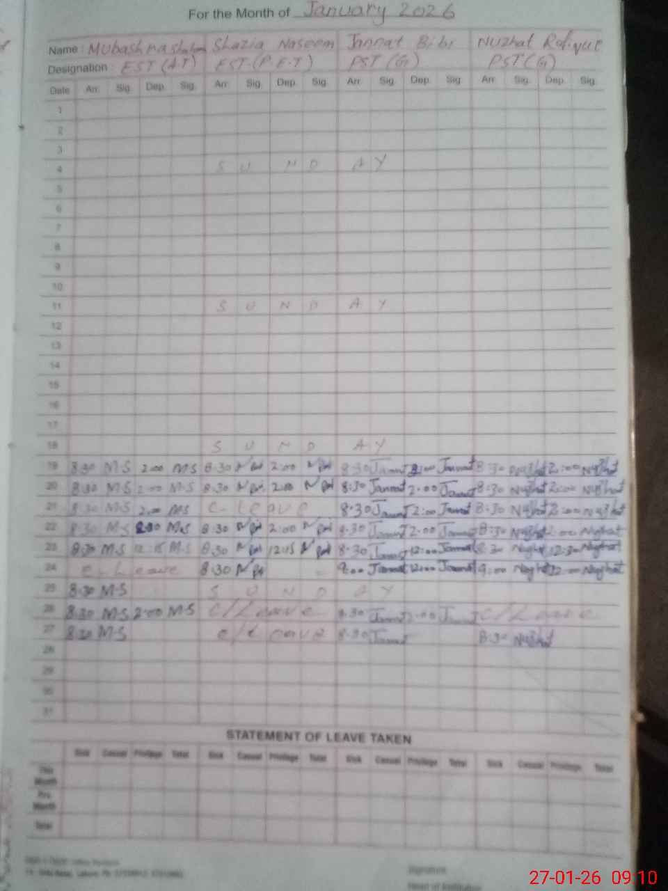 | CNIC | Full Name | Designation | R/C | Absence During Last Calender Month |