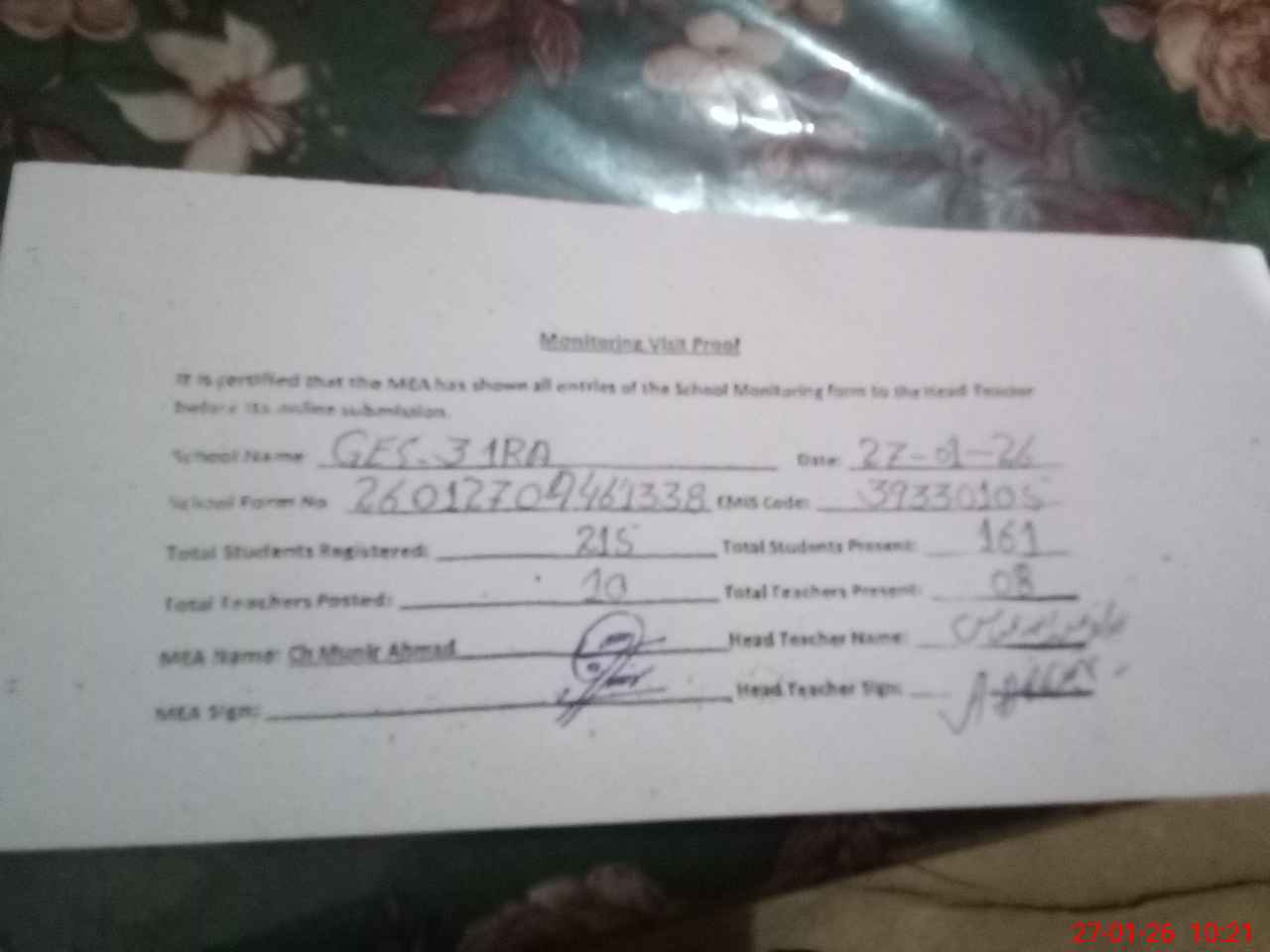 | EMIS Code: 39330105 | Name of School: GES CHAK NO. 3/1-RA | |||
