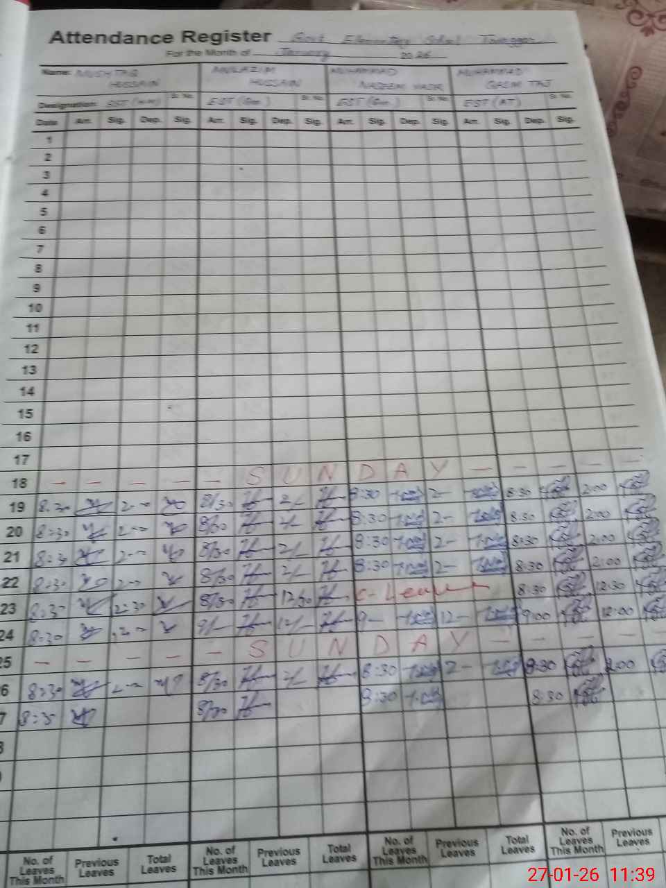 | CNIC | Full Name | Designation | R/C | Absence During Last Calender Month |