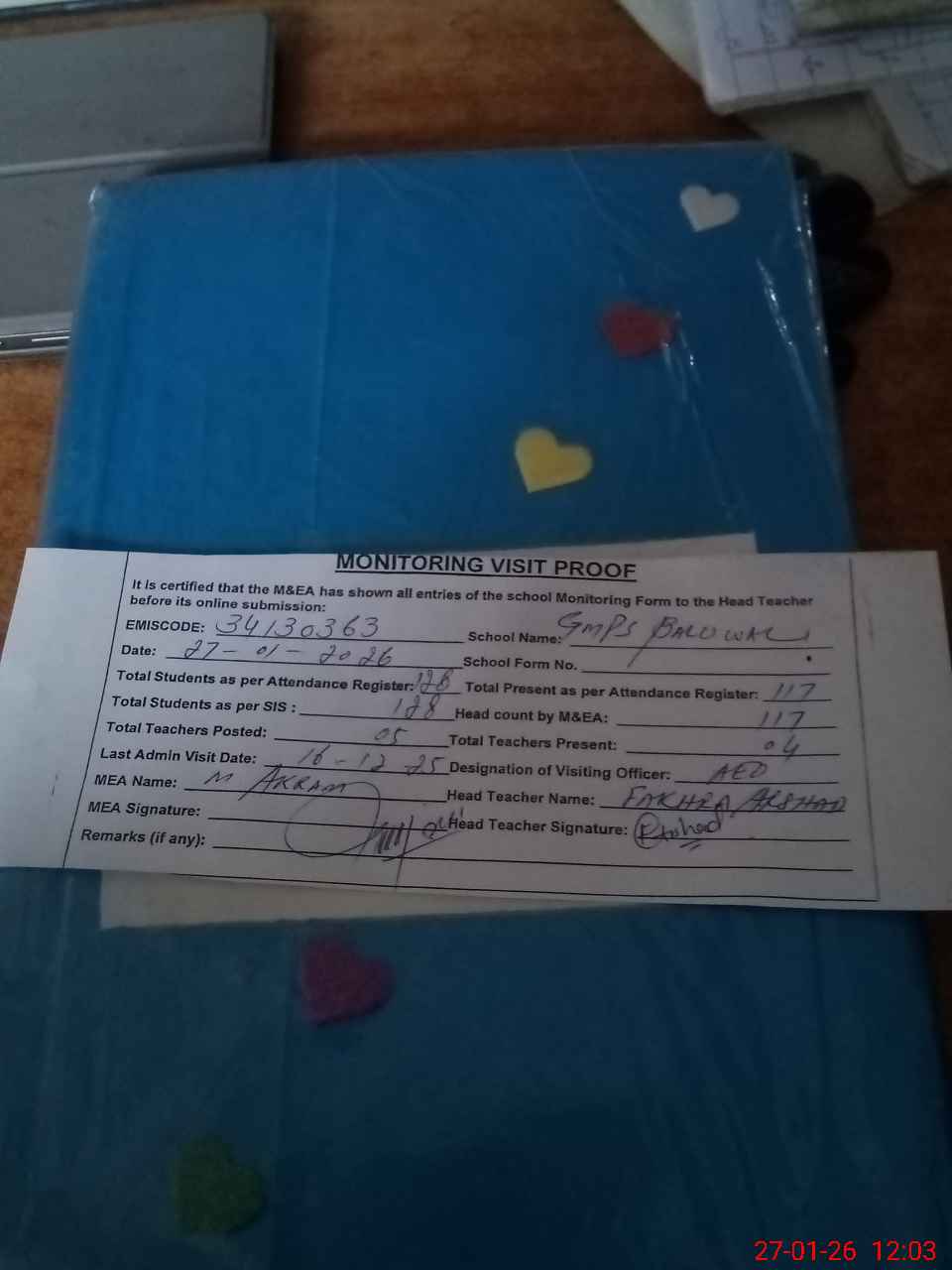 | Attendance Register | Head Teacher | MEA with School | Visit Proof |