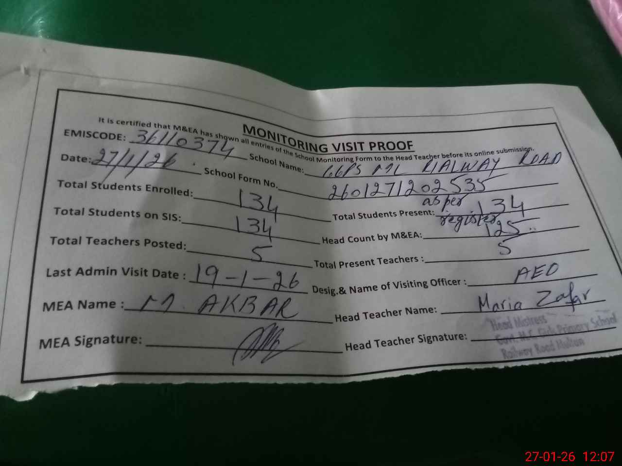 | Attendance Register | Head Teacher | MEA with School | Visit Proof |