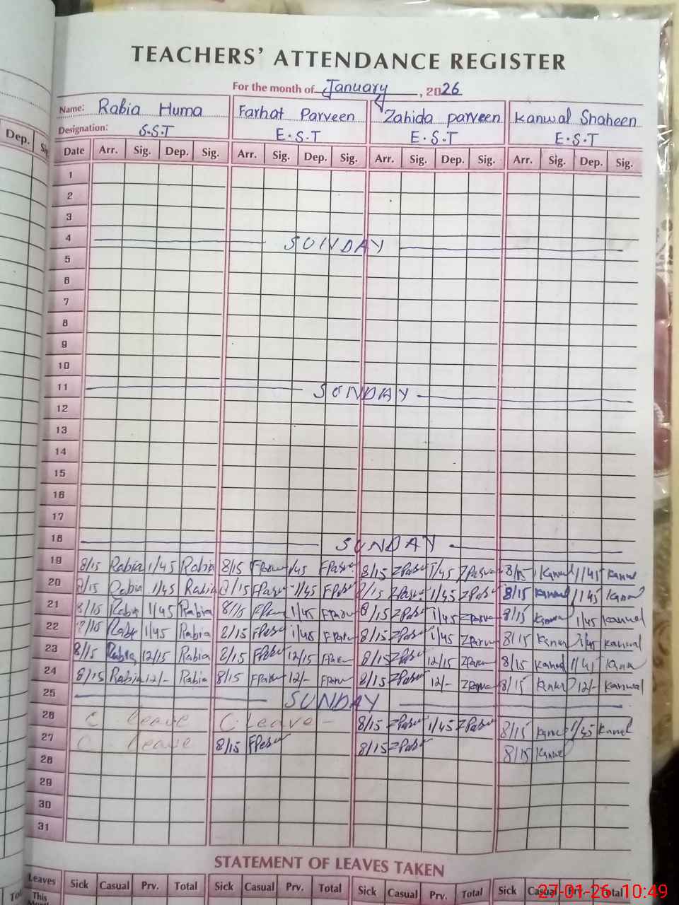 | Remarks (Use Separate Page if Required): EST Huma Anwar found absent since 23 January 2026 Approved leave was not present NSB register not updated | |||||