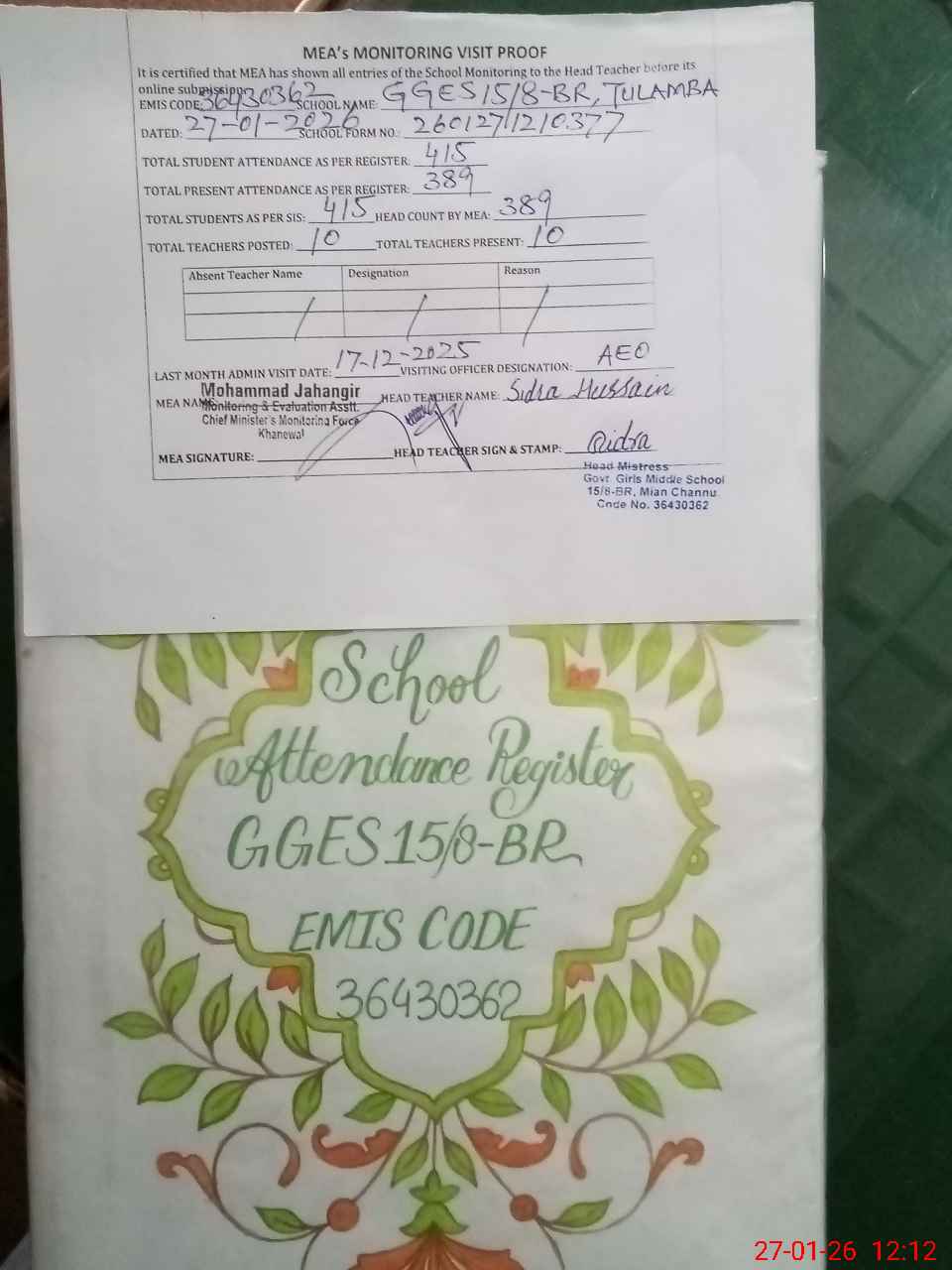 | Attendance Register | Head Teacher | MEA with School | Visit Proof |