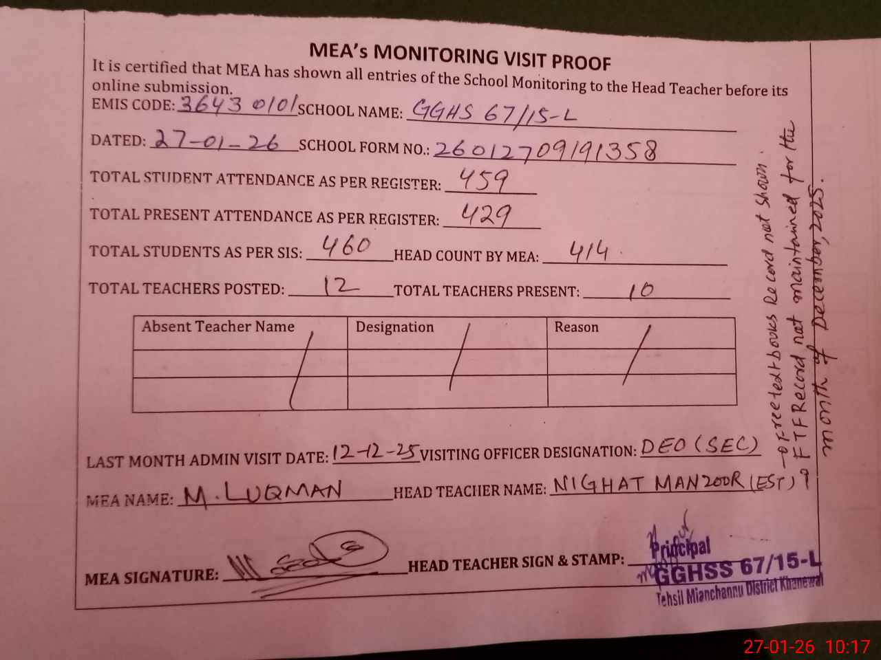 | Attendance Register | Head Teacher | MEA with School | Visit Proof |