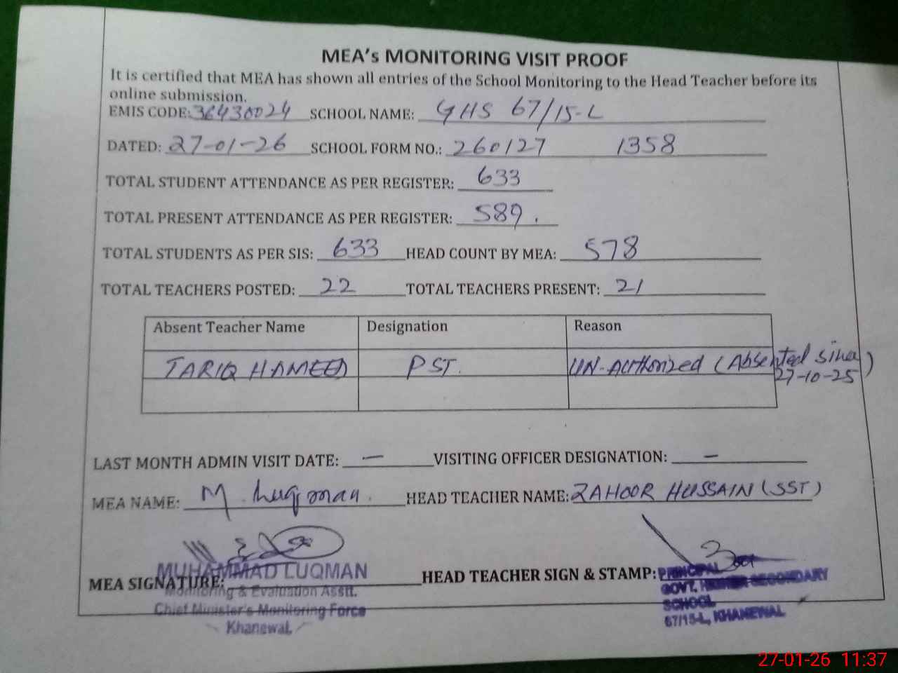 | EMIS Code: 36430024 | Name of School: GHS 67/15-L, MIAN CHANNU | |||