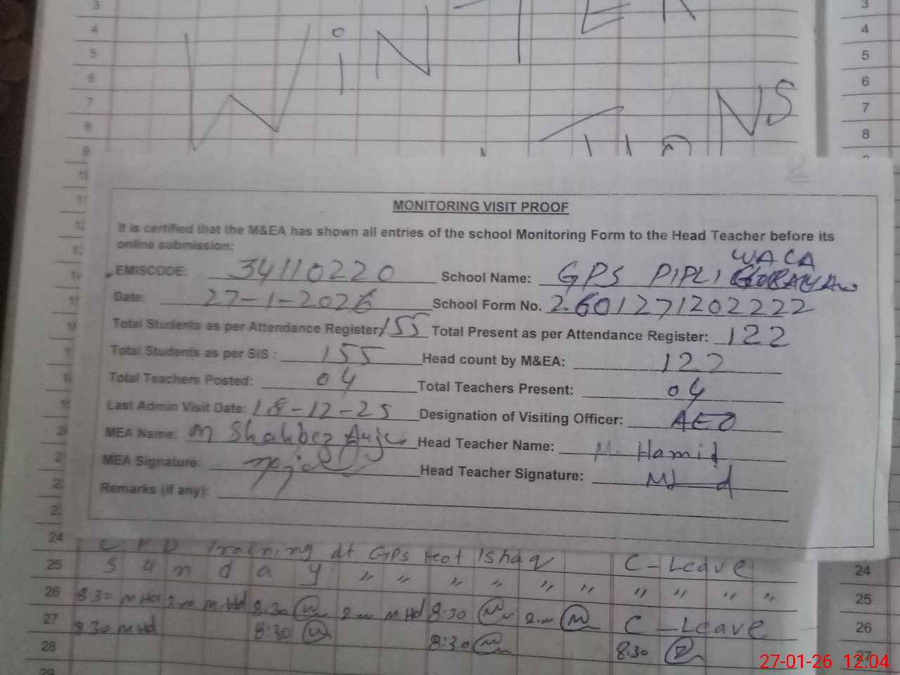 | Attendance Register | Head Teacher | MEA with School | Visit Proof |