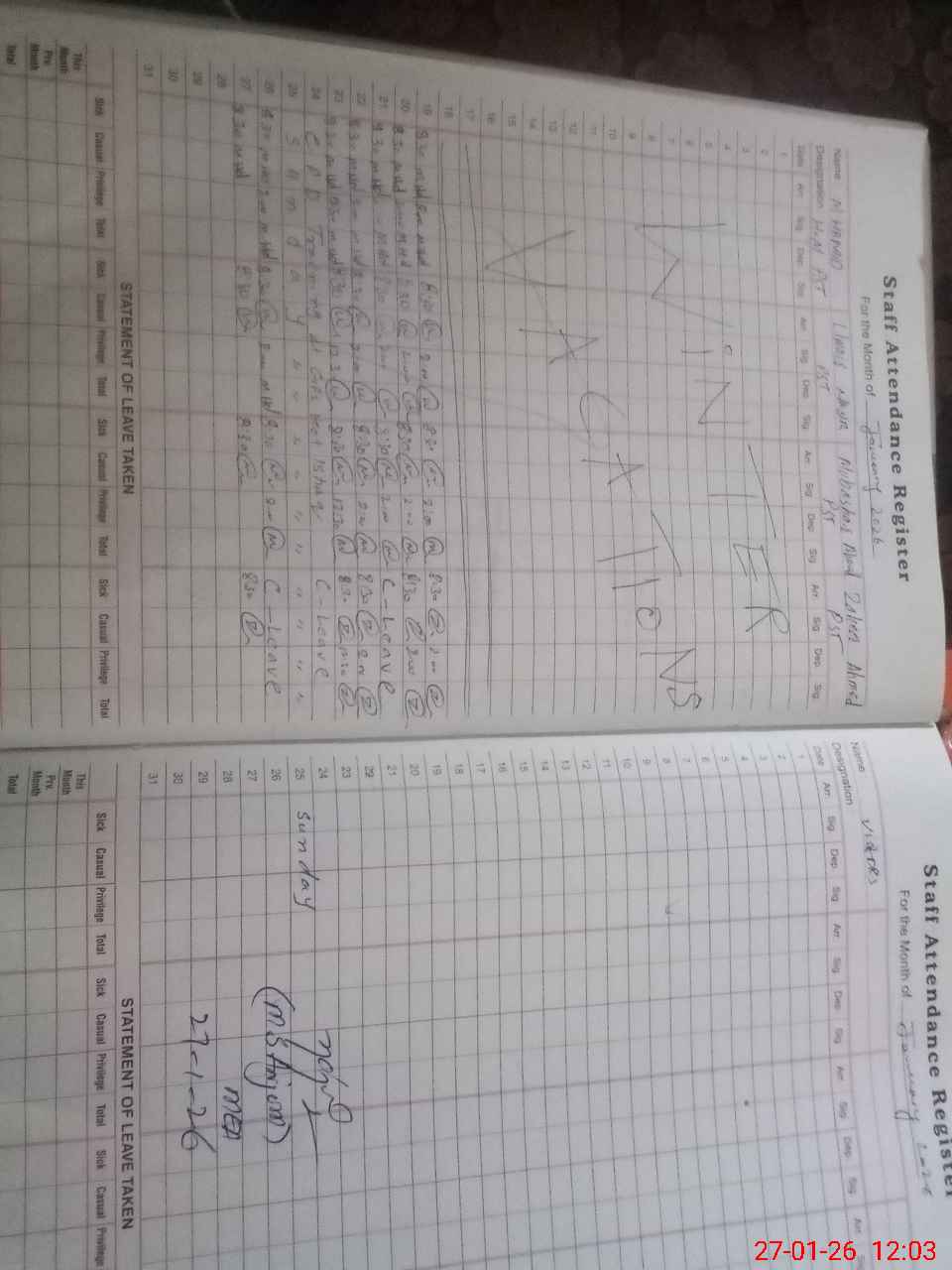 | CNIC | Full Name | Designation | R/C | Absence During Last Calender Month |