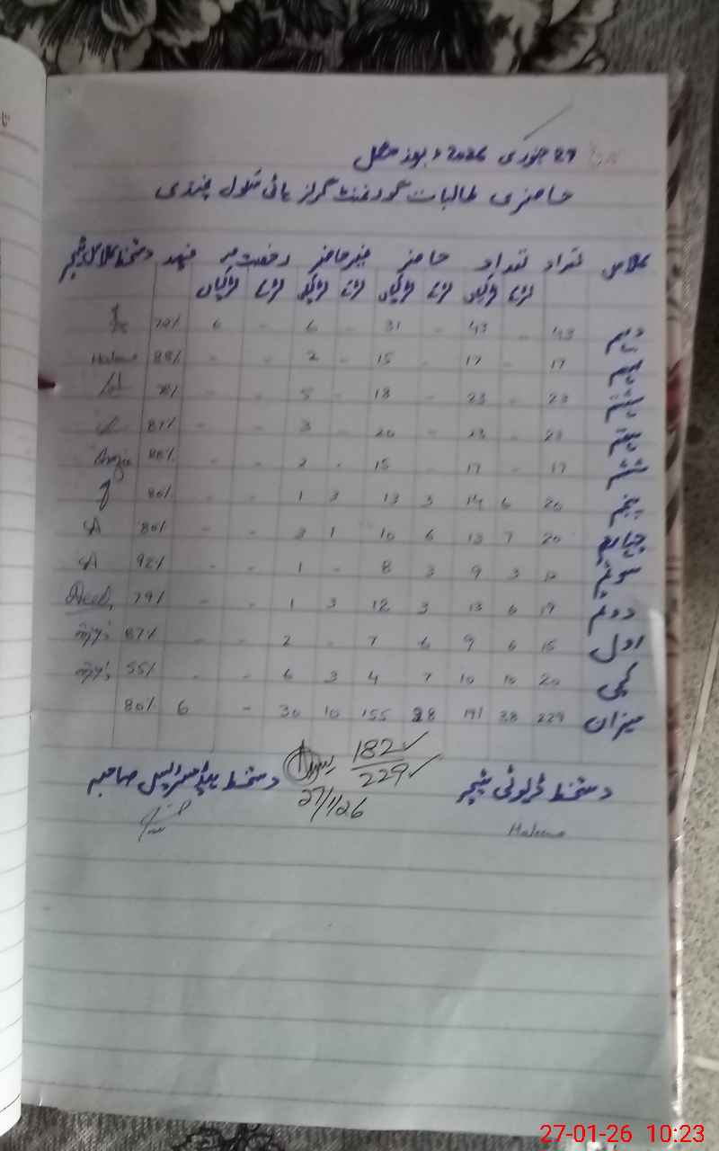 | Remarks (Use Separate Page if Required): Headmistress Ammra Munir SST marked as unauthorized absent due to non-availability of sanctioned casual leave proof during monitoring visit No admin visit in December 2025 NSB record not updated since November 2025 | |||||