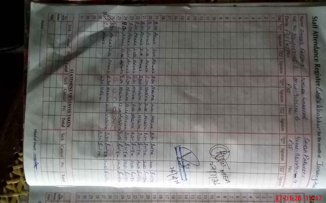 | CNIC | Full Name | Designation | R/C | Absence During Last Calender Month |