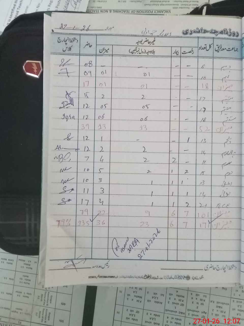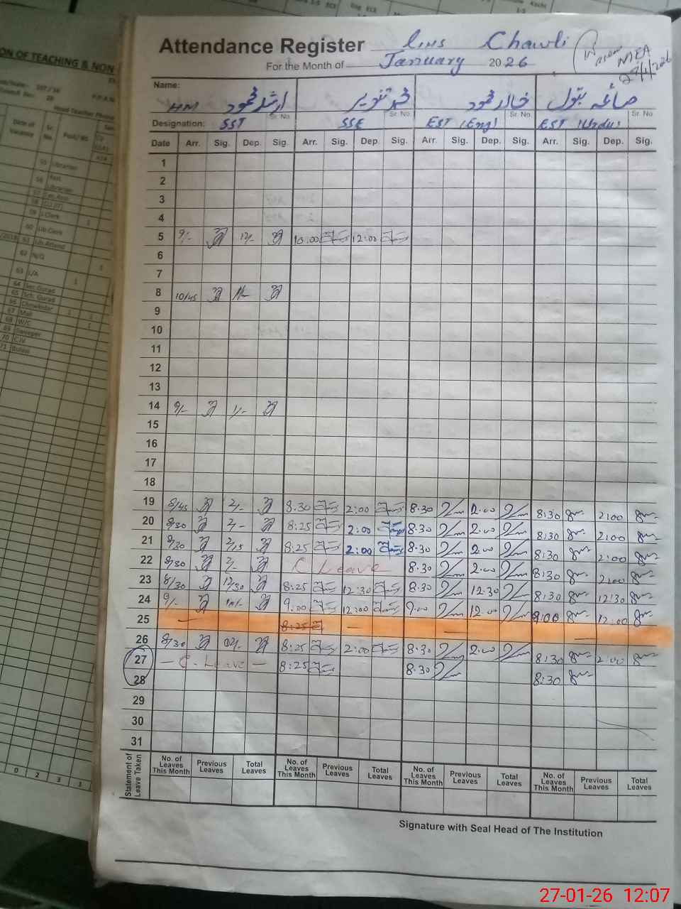 | Remarks (Use Separate Page if Required): Head teacher Arshad was marked on casual leave but no approved leave record was available on line so I marked unauthorized | |||||