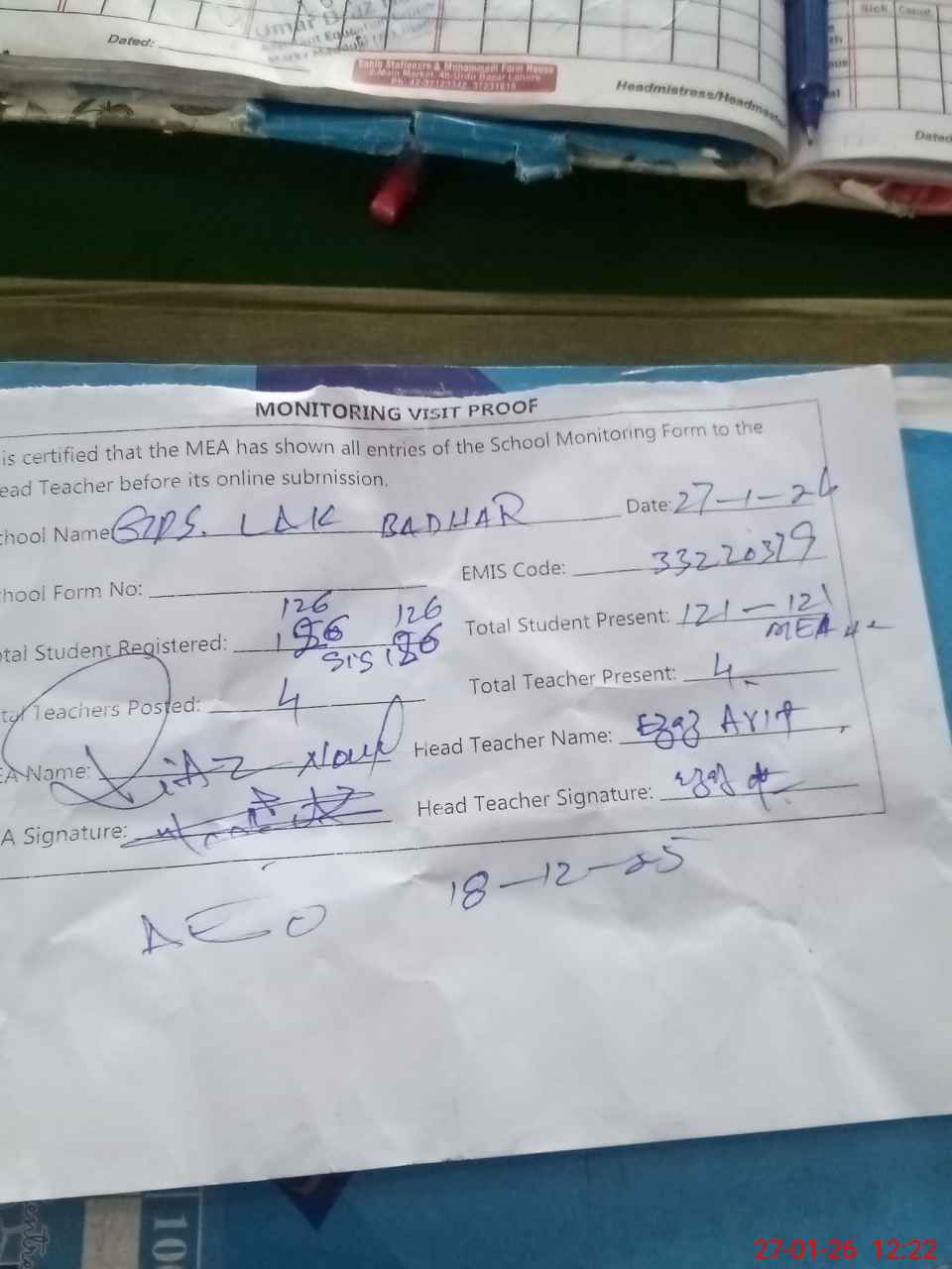 | Attendance Register | Head Teacher | MEA with School | Visit Proof |