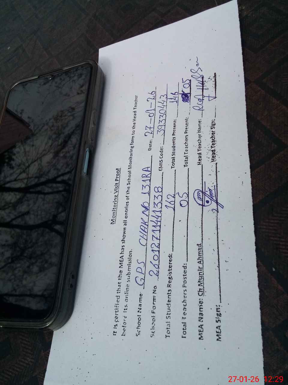 | Attendance Register | Head Teacher | MEA with School | Visit Proof |